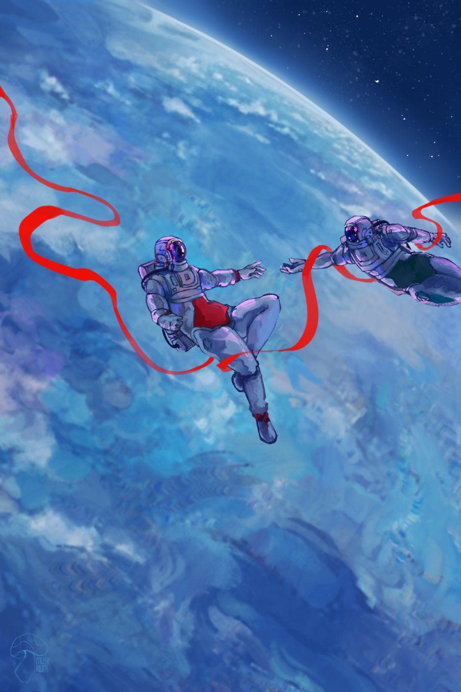 Valentine's day art trade with rebelliousfruitsalad.art (on ig)! You can check out their webcomic "See The Stars" on Tapas! It's like a fun, mysterious, dark space sci-fi satire set in Tazdahir--with cool eye-catching characters like Alya, the level-headed technician and Najm, a murder machine (who's got a soft side)--which we both drew here! https://tapas.io/series/See-the-Stars/info