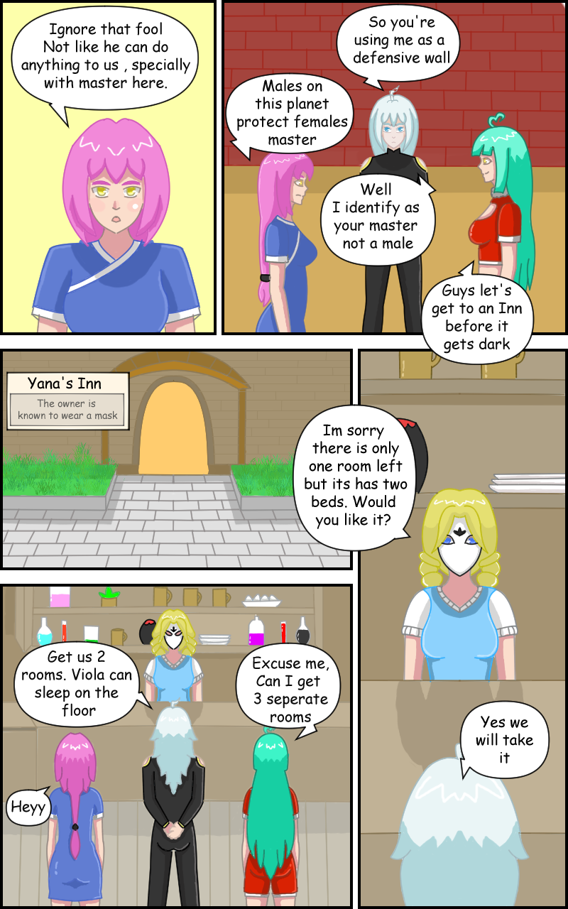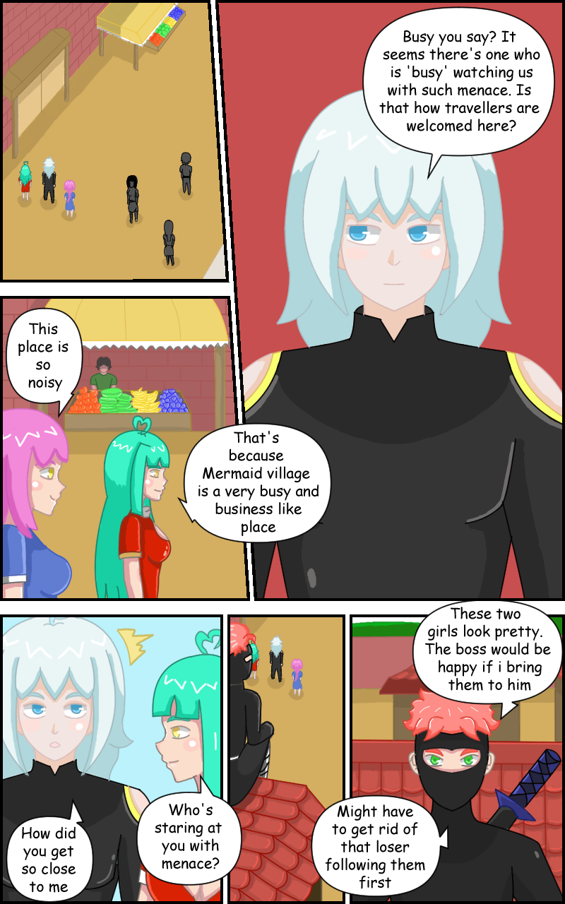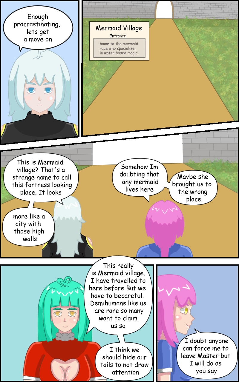 Quinn, Eva and Viola walked through the dense forest for a while and arrived at Mermaid Village. Upon arrival, Quinn sensed a very sinister stare aimed at the two girls. Ignoring the stares the group go to find an inn to rest for the night.