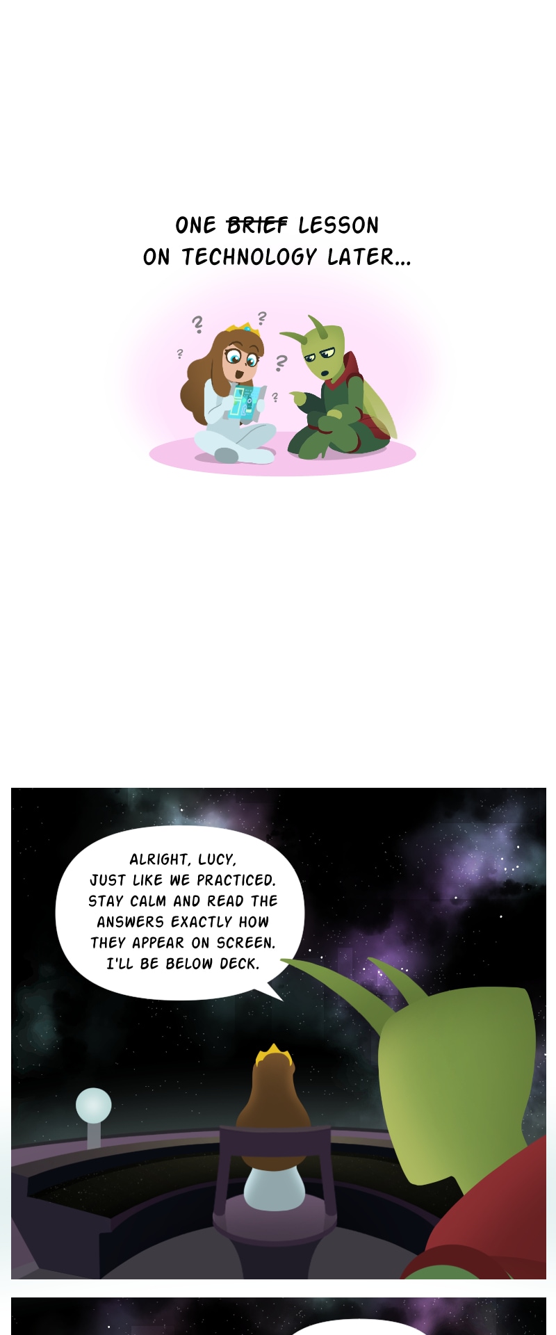 While waiting for her knight in shining armor to rescue her from a fire breathing dragon, Princess Lucy makes a poorly worded wish on a shooting star, and it takes her on a magical adventure to outer space! With help from the mysterious starstone, a fugitive alien prince, and many strange new friends, Lucy must navigate a whole galaxy to get back home, bringing a little bit of magic wherever she goes. [Updates weekly on Sundays!]