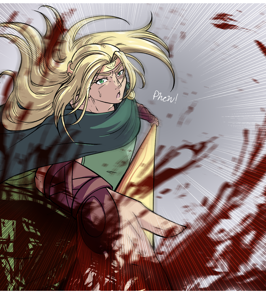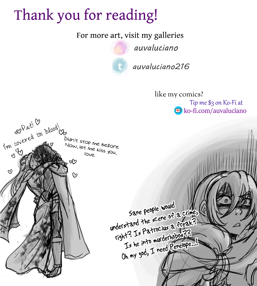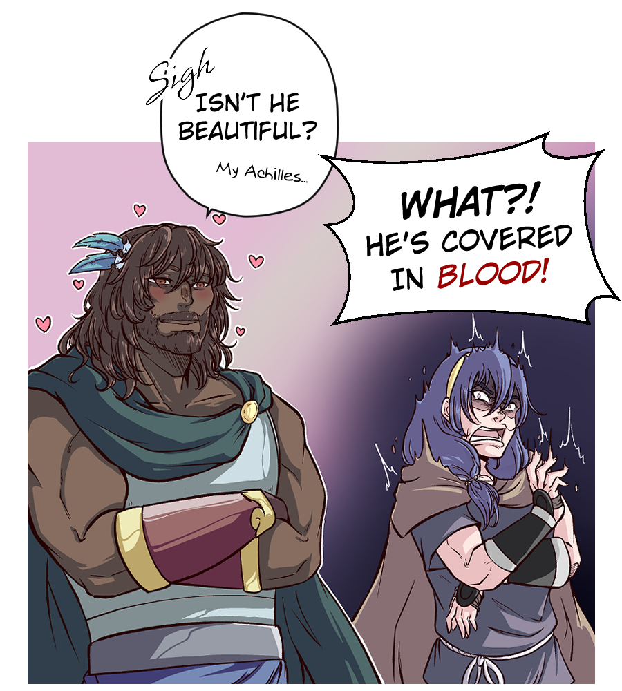 A little bit of blood isn't going to wane a man's love for his husband. Also, I sadly noticed that I forgot to color the olive branch in Odysseus' hair. Sadge. I'll be more careful about it in the future.