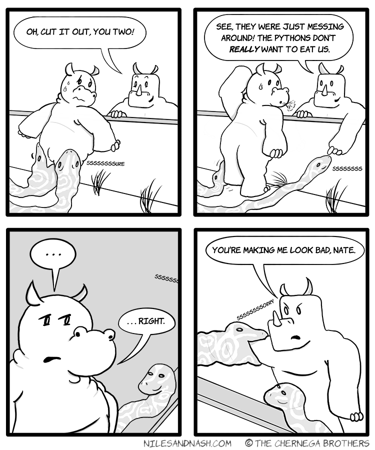 Niles and Nash is an all-ages gag-a-day comic strip about weird and wonderful animals trying to get along. But watch out -- this place is a zoo!