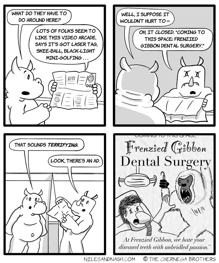 Niles and Nash is an all-ages gag-a-day comic strip about weird and wonderful animals trying to get along. But watch out -- this place is a zoo!