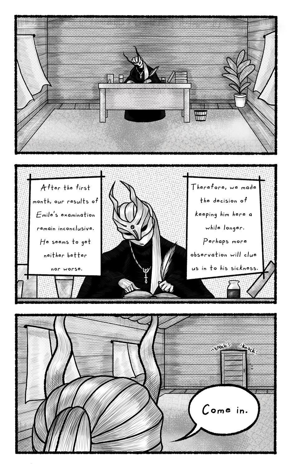 Emile stepped into the forest and met a shadow monster. He is now kept in a cabin: they claim he is sick, he insists he isn't. They all know something had changed him; that monster did something to Emile. Broken sleep cycle, sporadic appetite, and pitch black eyes. And, as the days crawl by, something eats away from inside him. Only time will tell what was done to Emile that night.