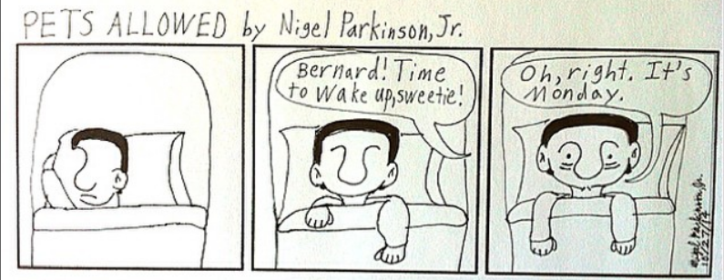 Comic strip of "Pets Allowed" by Nigel Parkinson, Jr. Enjoy! First panel: Bernard is asleep; Second panel: Joan: Bernard! Time to wake up, sweetie!; Third panel: Bernard: Oh, right. It's Monday.