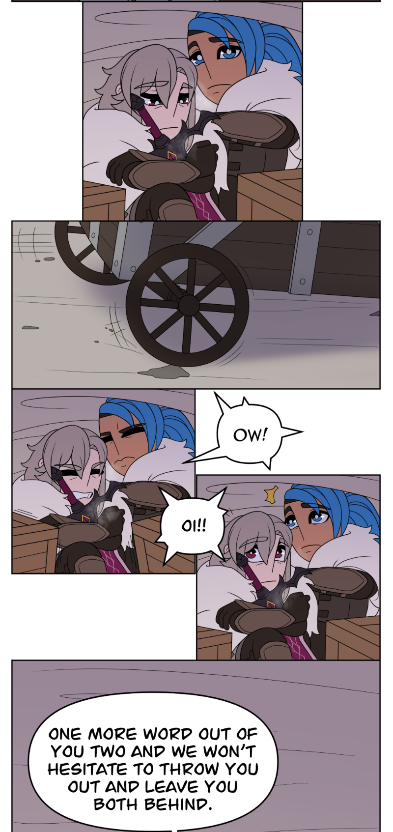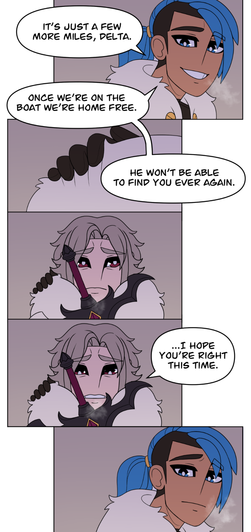 (Delta (silver hair) uses they/them (in future scenes however, Delta does accept she/her from their father only), Able (blue hair) uses he/him)