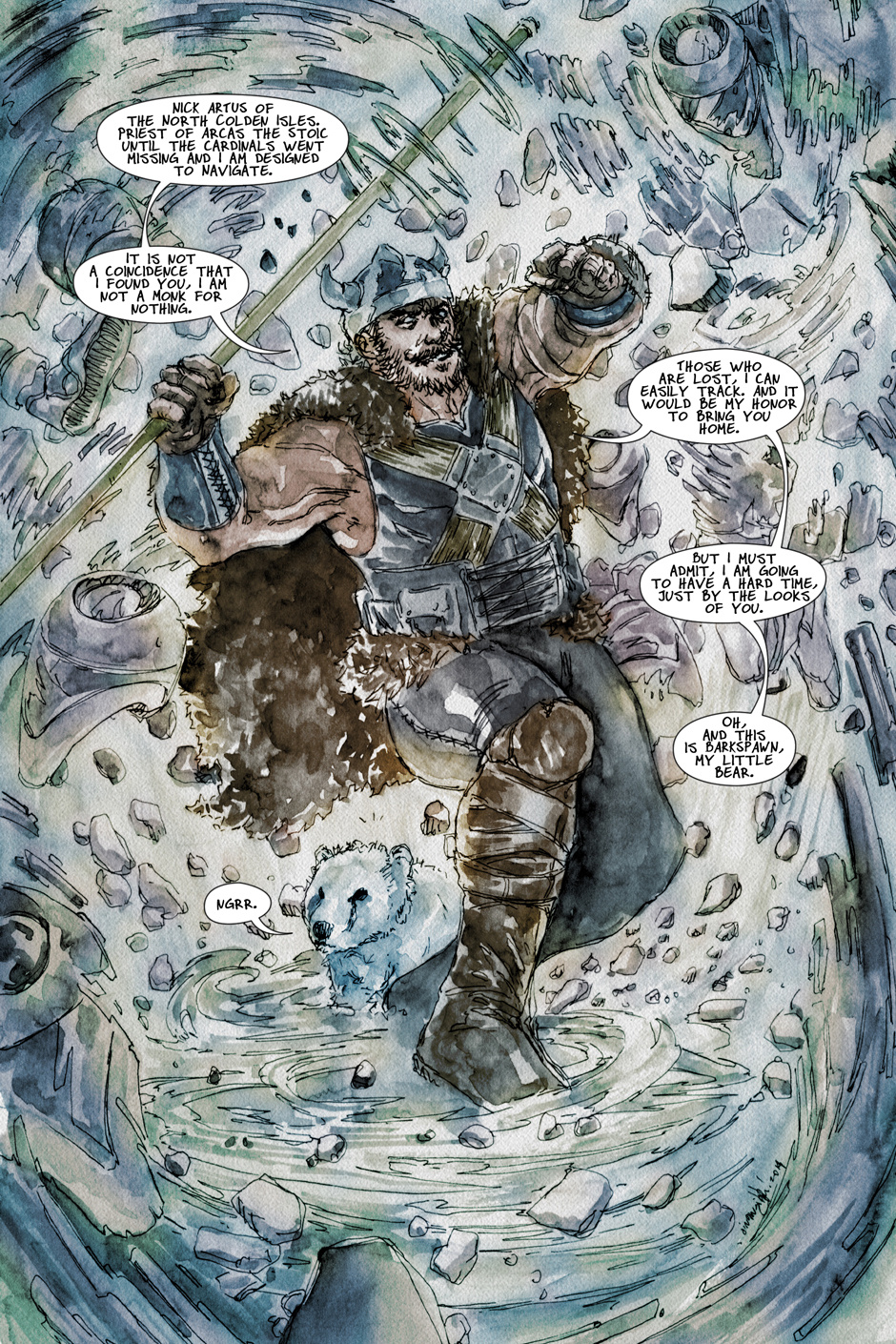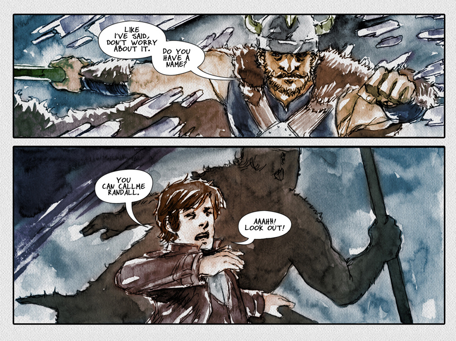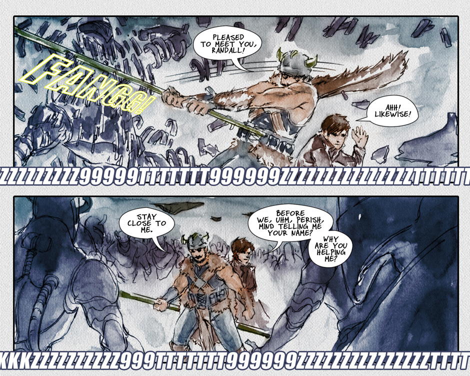 Warrior, like a Viking and those things, are like robots, except very fragile, or they guy is superstrong and seems like the guy has a small dog like pet.