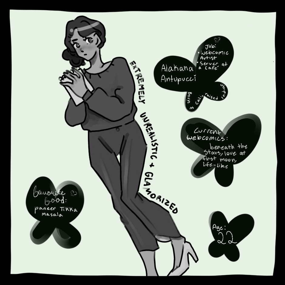 Alakana Antupucci, or Kana for short, is an aspiring artist with three comics under her belt, “beneath the stars”, “Love at first moon”, and “Life-Like”. Her childhood best friend Alainn Leam-Han is her pen-pal, as well as an underground author. One day, they meet again for the first time in years due to unforeseen circumstances, and discover many things, some small and some…magical.