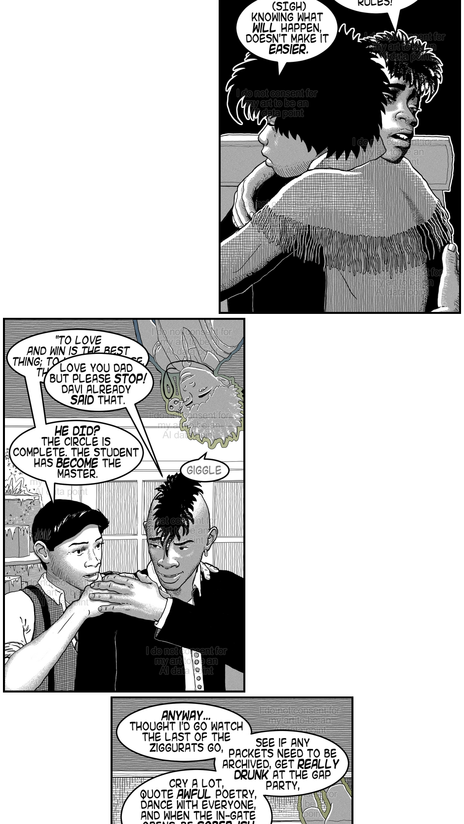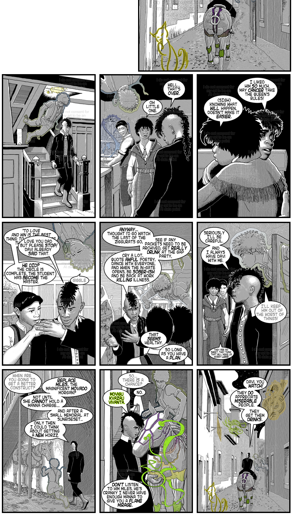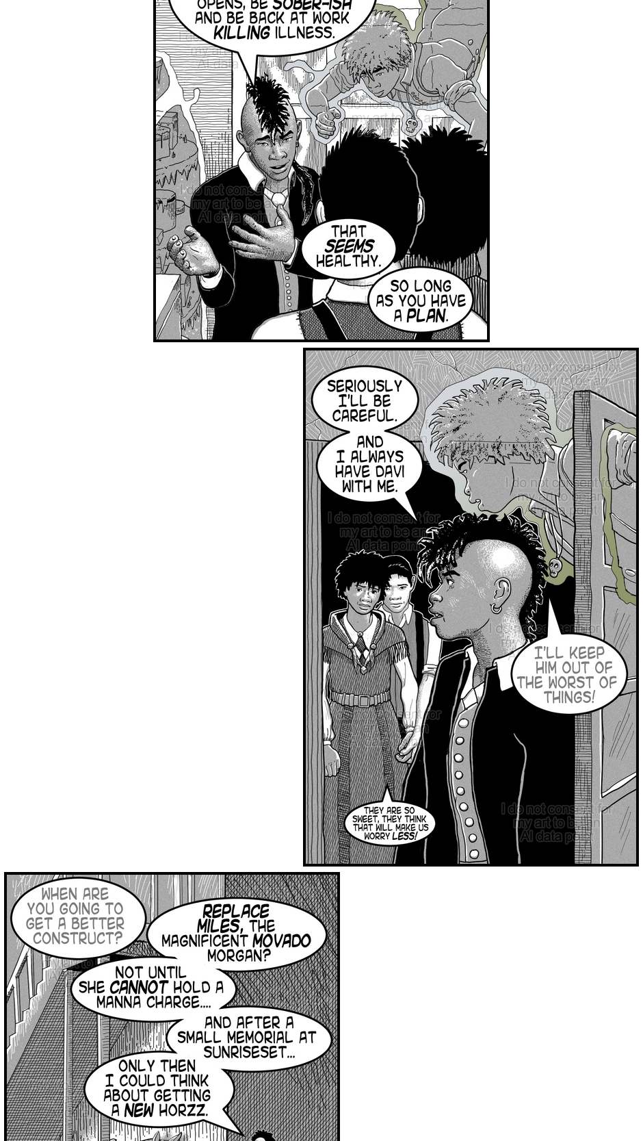 Ok parents are adorable! I think Bruno's outfit is my favorite, I enjoy seeing how his clothes contextualize his hairstyle and piercings and vice versa. Didn't register the loss of color till you pointed it out. Looking back I will miss seeing Bruno's skin tone specifically. Overall I agree that the story reads better in grayscale. 👌😌 You're doing amazing!