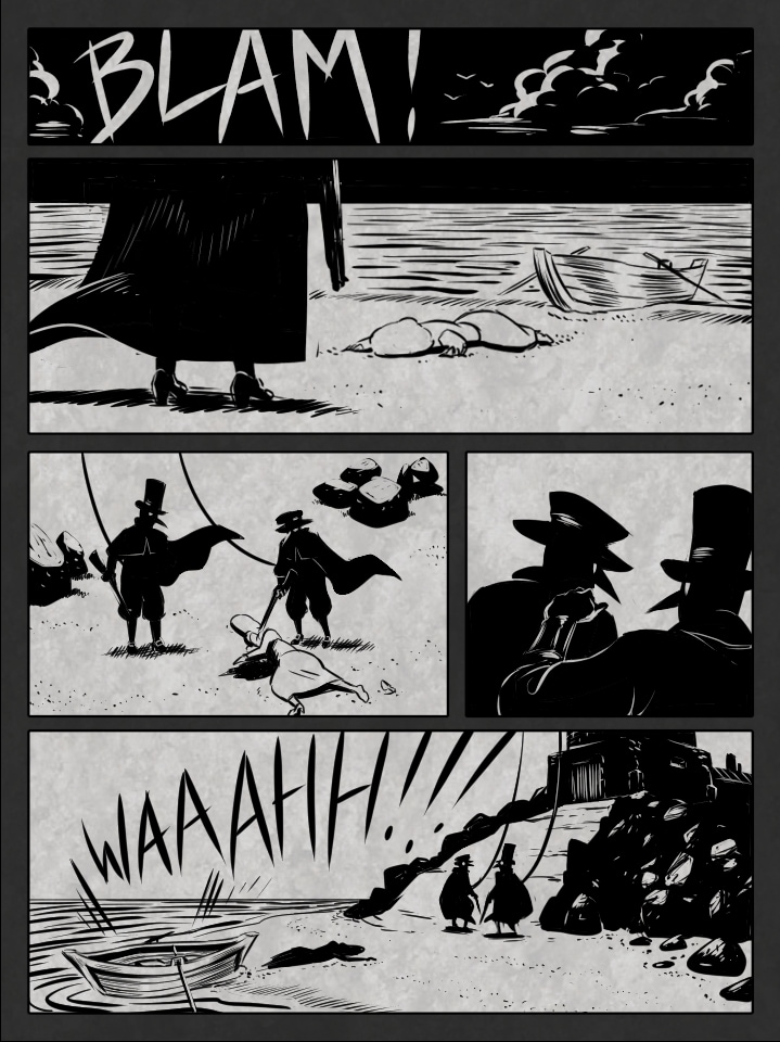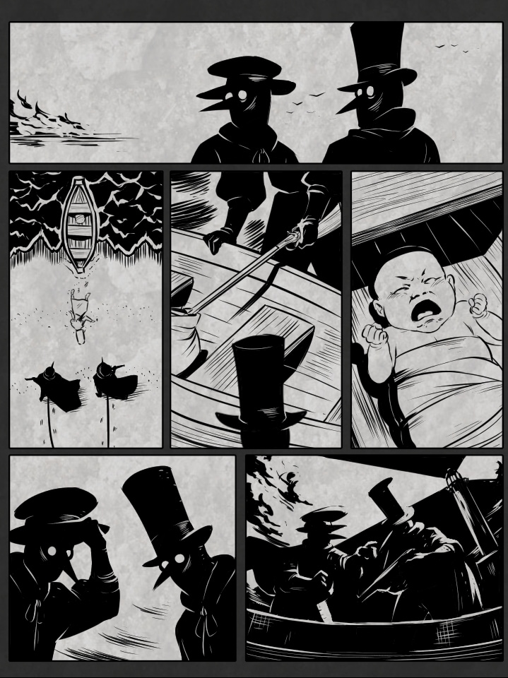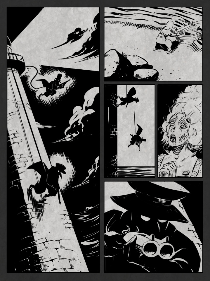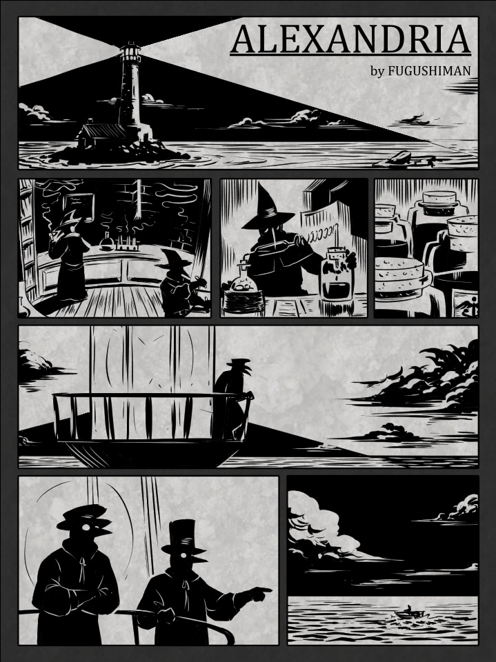 FR - Petite bd réalisée pour un challenge dont les thèmes étaient "phare" et "épidémie mystérieuse". J'ai voulu m'appliquer sur le travail du noir et du blanc. J'ai hésité à ajouter des textes, mais comme d'habitude, je préfère laisser planer un peu trop de mystère que pas assez.