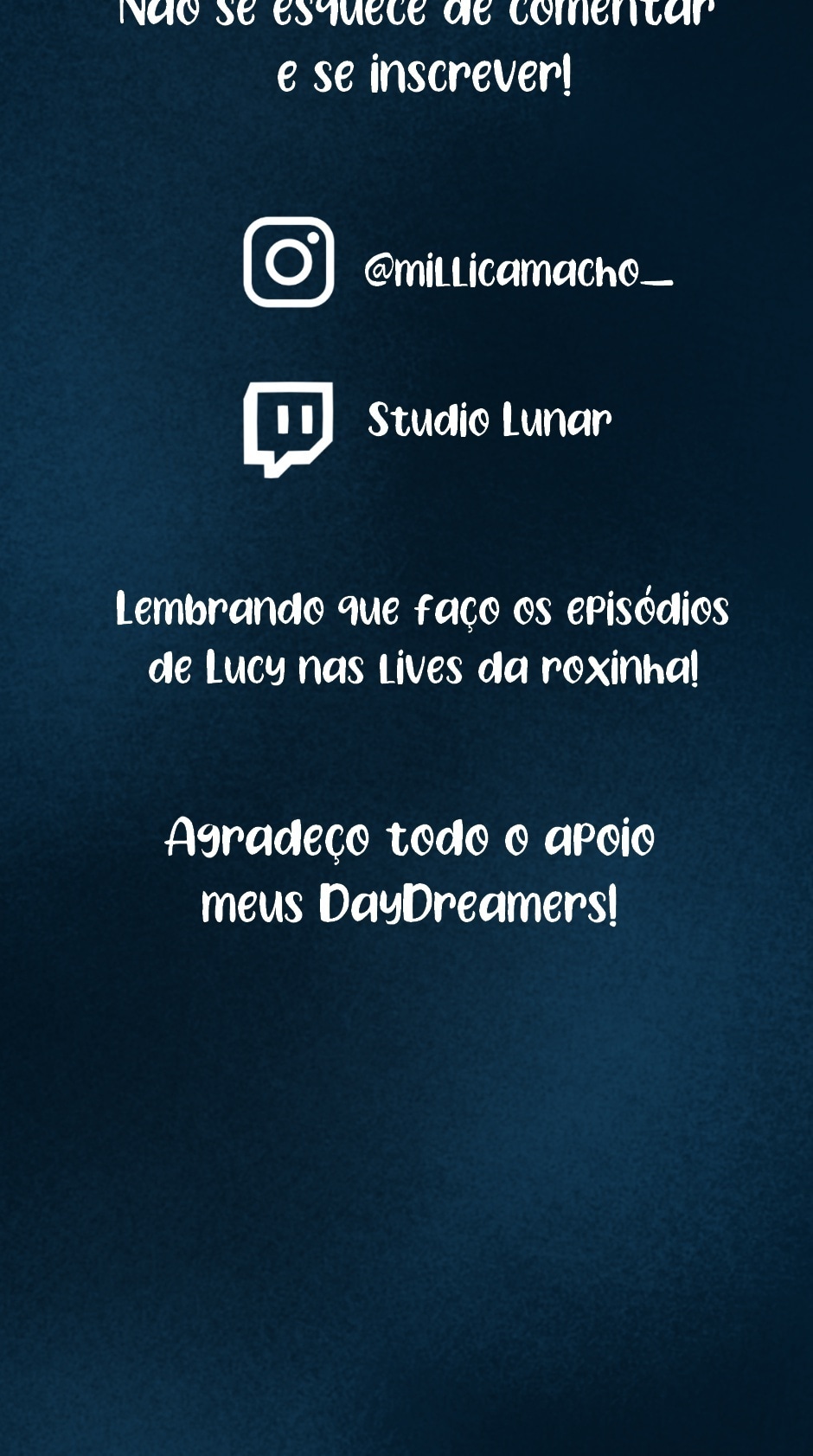 DayDreamers agradeço todo o apoio e paciência! Agora os episódios vão demorar 21 dias para sair, mas é por uma boa causa! Não quero fazer correndo e de certo se tivesse mais tempo para me dedicar ao webtoon eu me dedicaria!