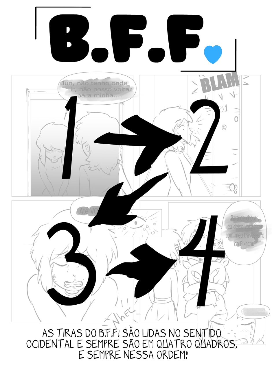 B.F.F. tem a missão de ser uma tirinha de humor e romance feita em quadrinhos de apenas uma pagina, contada em quatro quadrados sequenciais, numa história não linear.