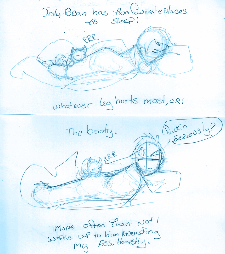 More often than not I wake up to the sound of purring and the sensation of cat paws trying to stealthily knead at whatever amount of blankets are between me and Jelly Bean. It's both annoying as hell and adorable as shit.