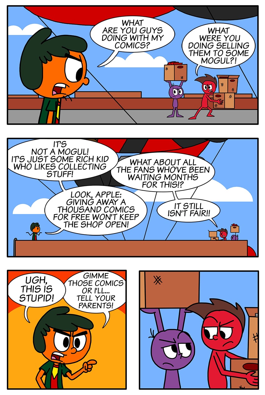Apple and Grape sneak out of school to get a free comic book! Follow and purchase! Instagram https://www.instagram.com/apple.and.grape Facebook https://www.facebook.com/appandgrpe Redbubble https://www.redbubble.com/people/chazs-stuff/shop?artistUserName=chazs-stuff&collections=2501616&iaCode=all-departments&sortOrder=relevant Buy a book! https://www.lulu.com/search?keyword=apple+and+grape&page=1&pageSize=10&adult_audience_rating=00