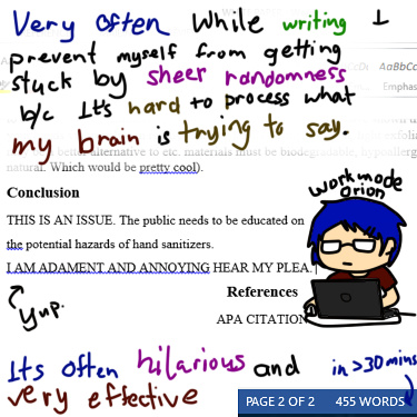 I just thought what I wrote was pretty funny and though I might share a little bit of my writing process. Having ADHD, writing papers has always been one of the most difficult things for me to do, over the years I have trained myself to stay on task with some of the most ridiculous of strategies. This one has always worked rather well for me over the years.