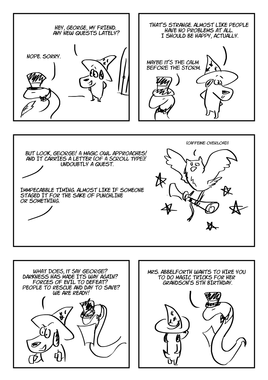 Through light themes such as positivism and one's life values to the less light ones such as Weltschmerz and crushing nihilism, the comic follows the adventures of a certain Wizard Dog, a magical anthomorphic dog, and his friends, as they quest through seemingly nonsensical world of fantasy cliches, into the absurdity and beyond.