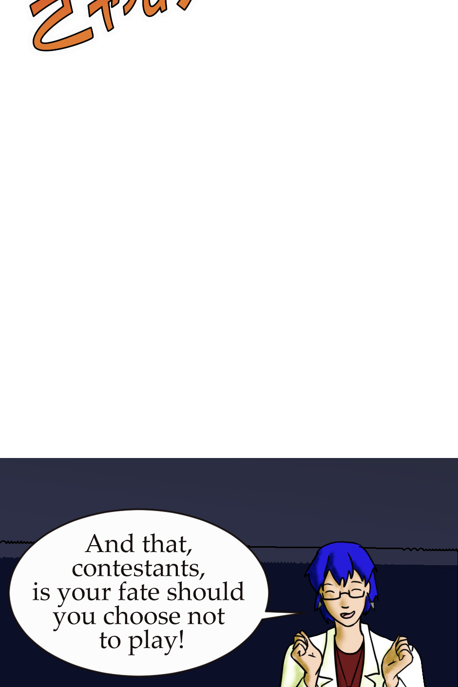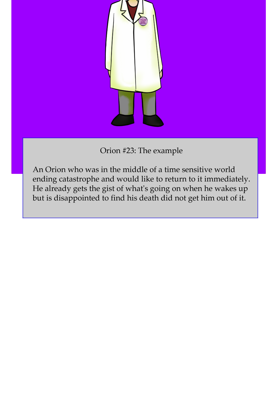 An Orion somewhere out in the universe has grown bored of the standard battle royale/death game genre and decided to make his own. This will not go as planned. 25 slightly different Orion's from various parts of the Rintz sector will face off in a fight to the death? deaths? How exactly does this work if they're all immortal anyway? Well that's not my problem I'm just the narrator.