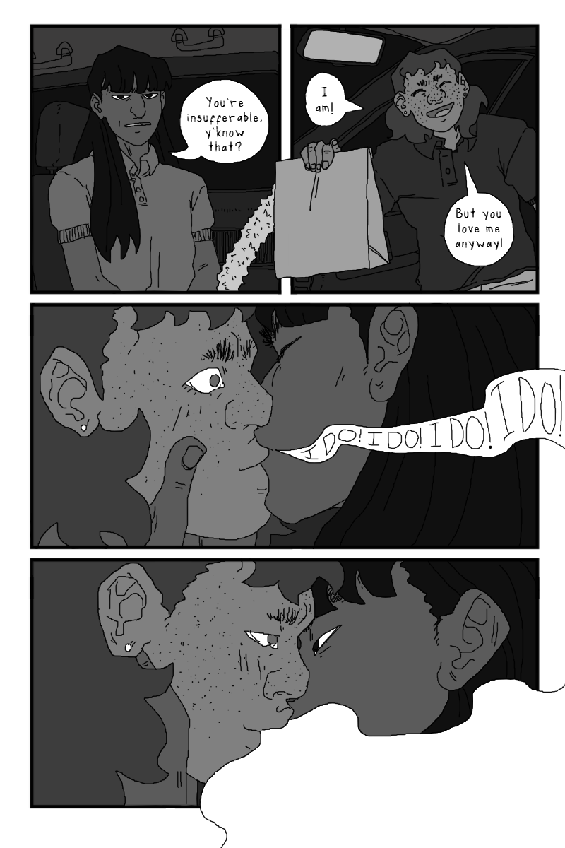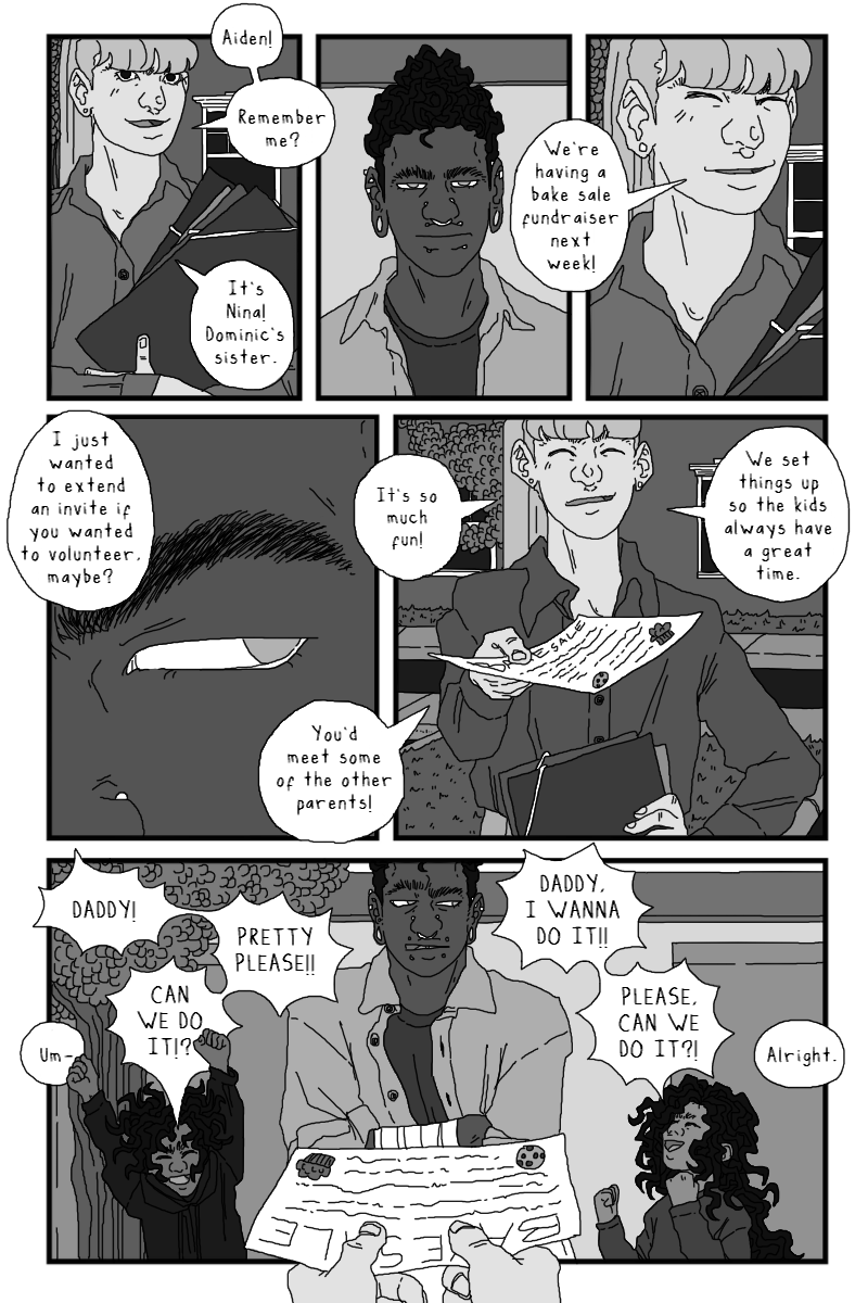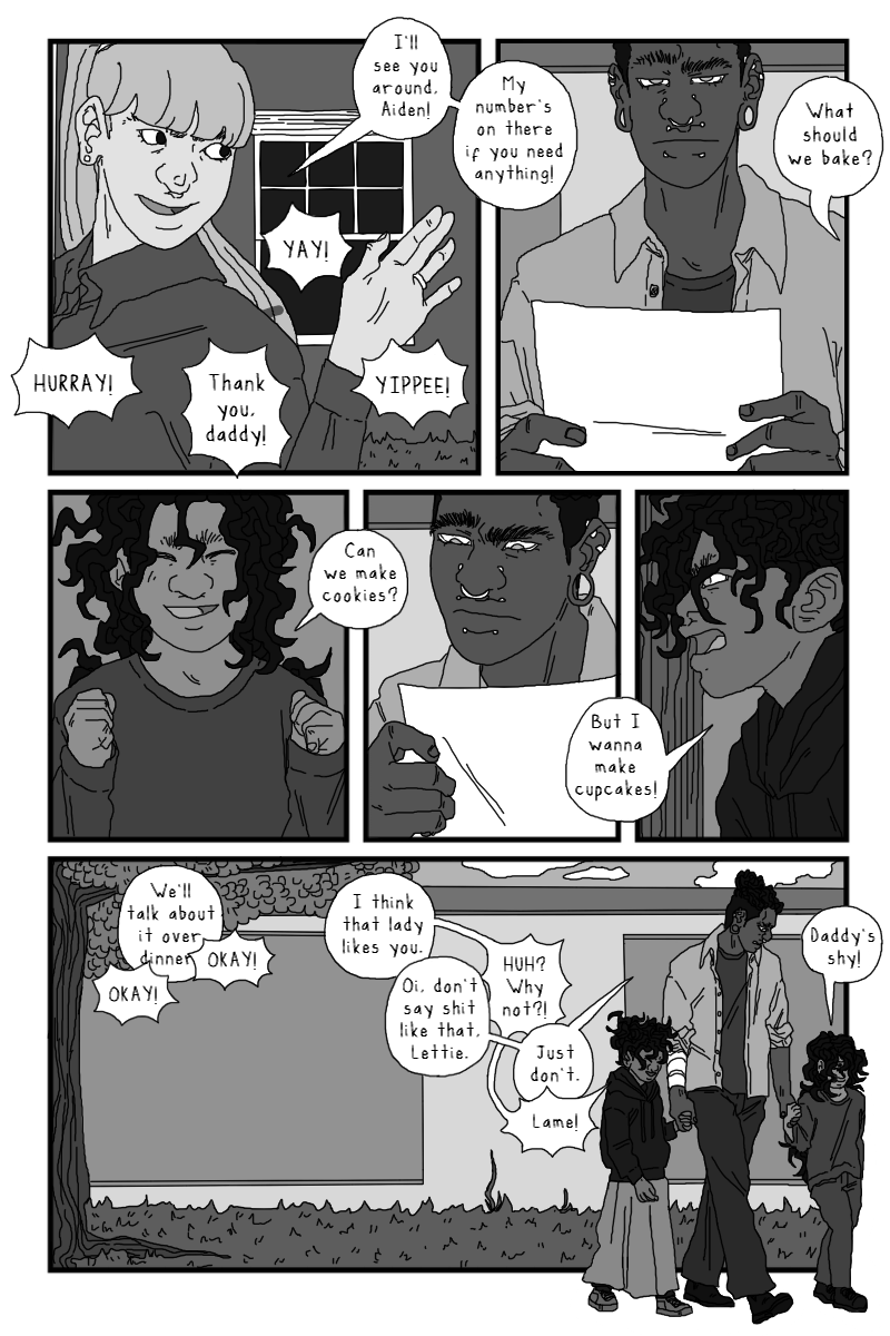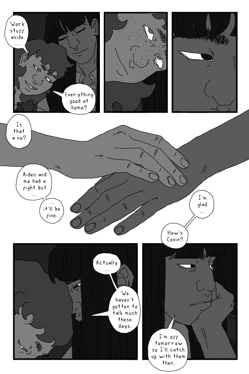The scene with Onyx and Rosemary is really sweet, I'm in love with the speech bubble turning into smoke during the kiss, and all the soft expressions. I'm glad to see more of Rosie! And speaking of seeing more of people, super excited to finally get some Covin lore 👀 All in all another banger! can't wait till next chapter!!