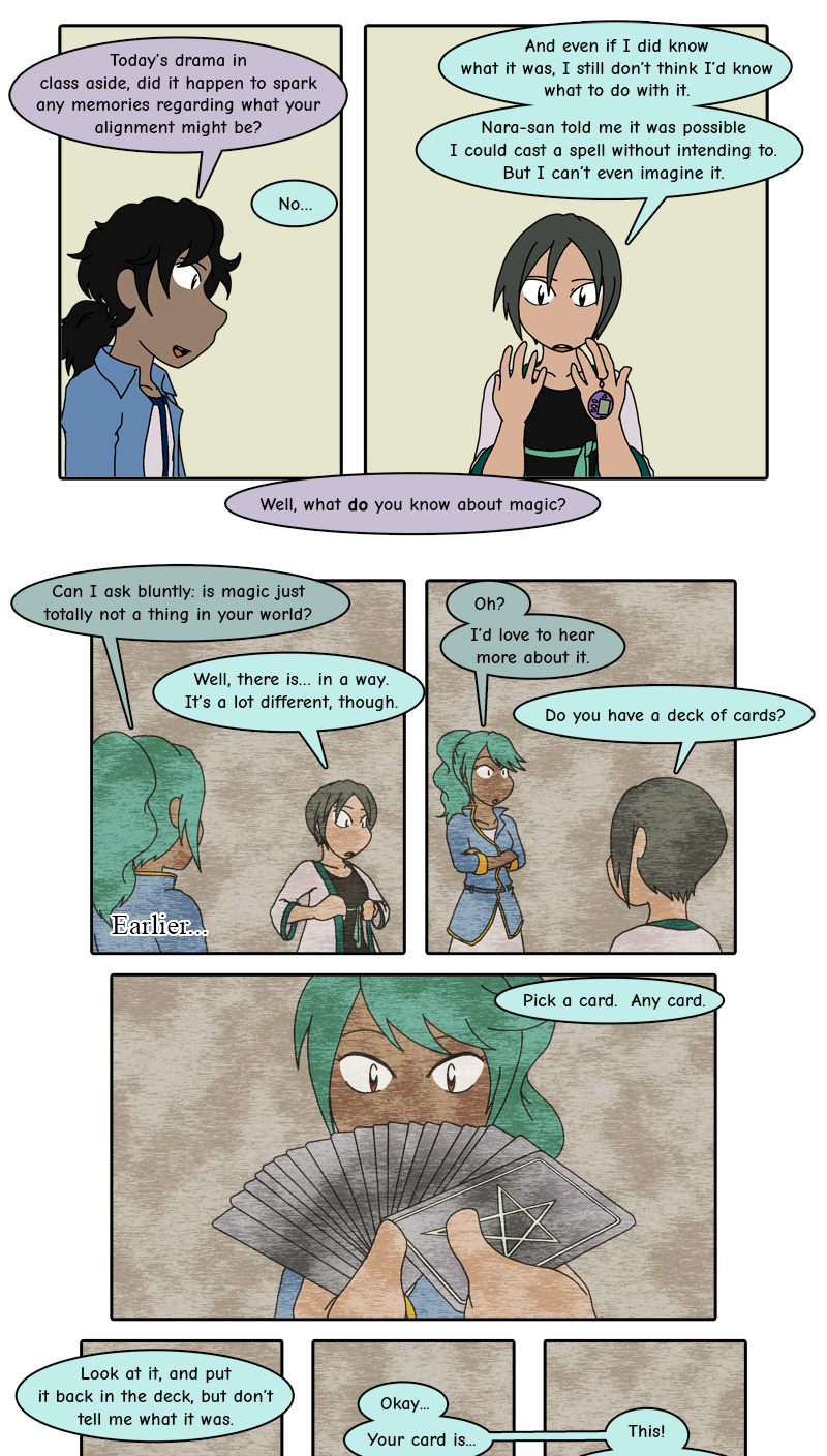 Fun fact: This is actually one of the first scenes I planned for the comic. Chiaki's already mentioned that there's no demi-humans or demons in her world, but I liked thinking about how she might respond if someone asked her about magic in her world. And sure, I could've leaned into her going over magic systems in various games and yammering about Espers and Materia and Swordians and Crest Graphs and such, but there is a "sort" of magic in real life. Even if we're just talking about sleight of hand performance.