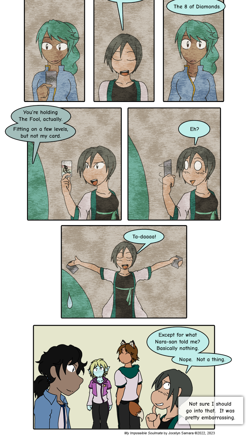 That said, just because you know of this kind of magic - even if you know how the trick works - it doesn't necessarily mean you can do it. So naturally, Chiaki botches this. And spectacularly too, as she guesses a playing card while drawing a Tarot card. (And yes, I drew my own The Fool card for this page. Here's a closeup version if you care about my homemade Tarot card.)