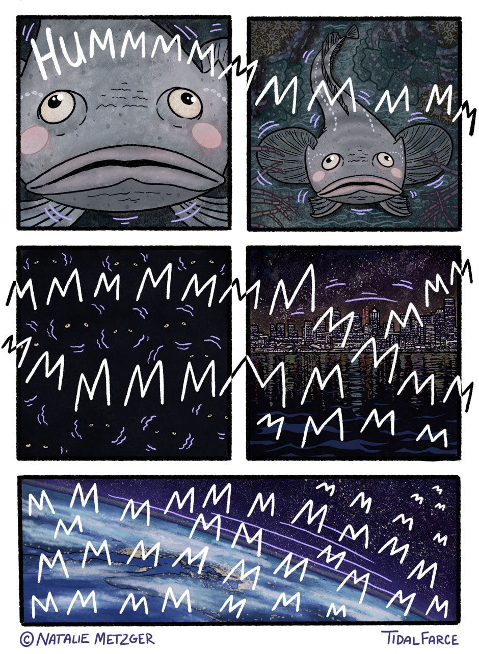 Also known as a toadfish, these large headed fish have a series of bioluminescent photophores on their undersides as well as on their sides and face. While that is pretty fancy for an otherwise drab looking fish, their real rock star moment is during mating season when the males migrate from the deep up to the inter-tidal zone and try to out hum each other in the shallows. The cacophony is so loud that folks living on or near the water on the west coast of the US and Canada get to experience a late night vibratory event that has caused quite the hub-bub in both Seattle and San Francisco.