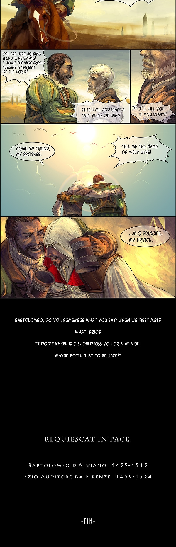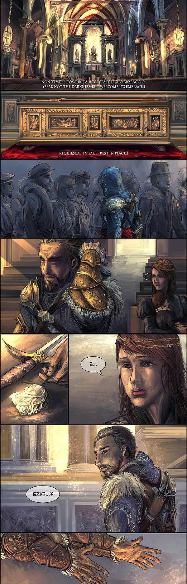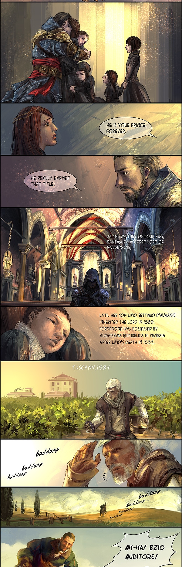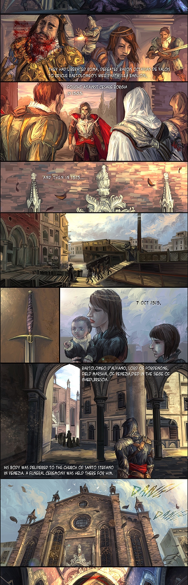 After Bartolomeo’s death, Ezio came to Venice to attend his funeral and meet with Pantasilea and her daughters.