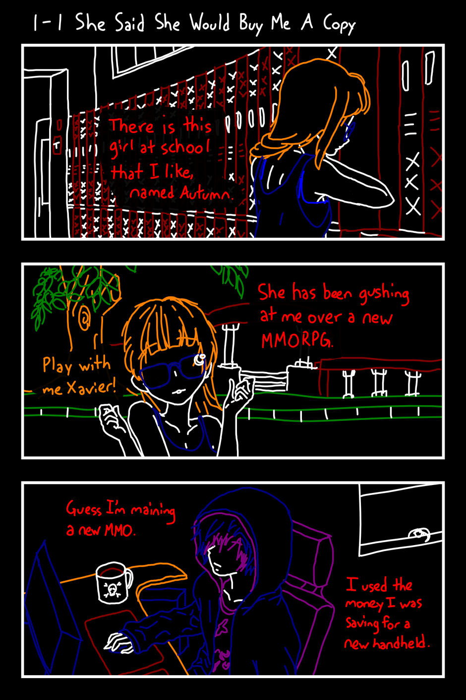 There is this girl at school that I like, named Autumn. Play with me Xavier! She has been gushing at me over this new MMORPG. Guess I'm maining a new MMO. I used the money I was saving for a new handheld.