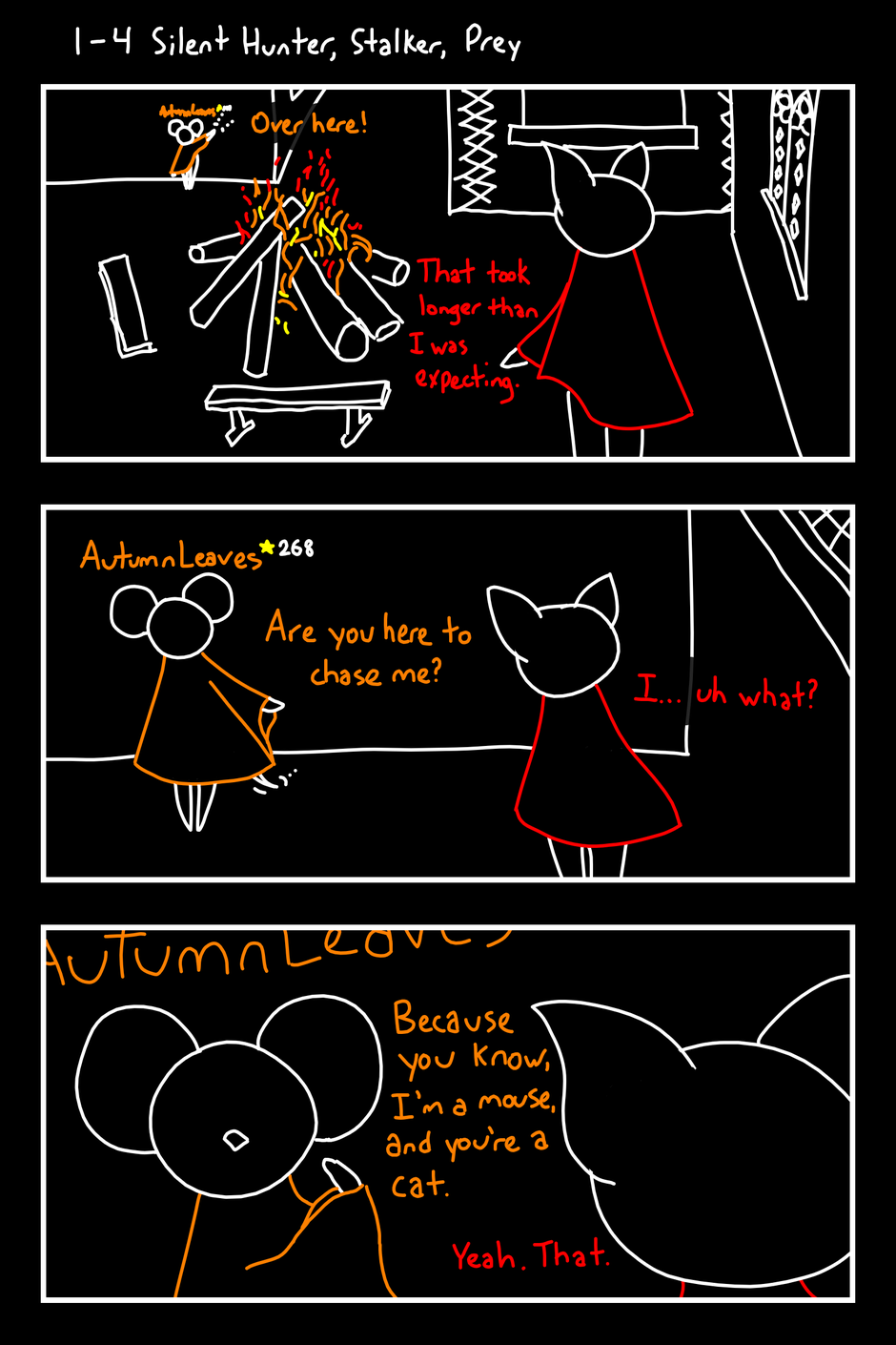 AutumnLeaves 268 Over here! That took longer than I was expecting. AutumnLeaves 268 Are you here to chase me? I... uh what? AutumnLeaves Because you know, I'm a mouse, and you're a cat. Yeah. That.