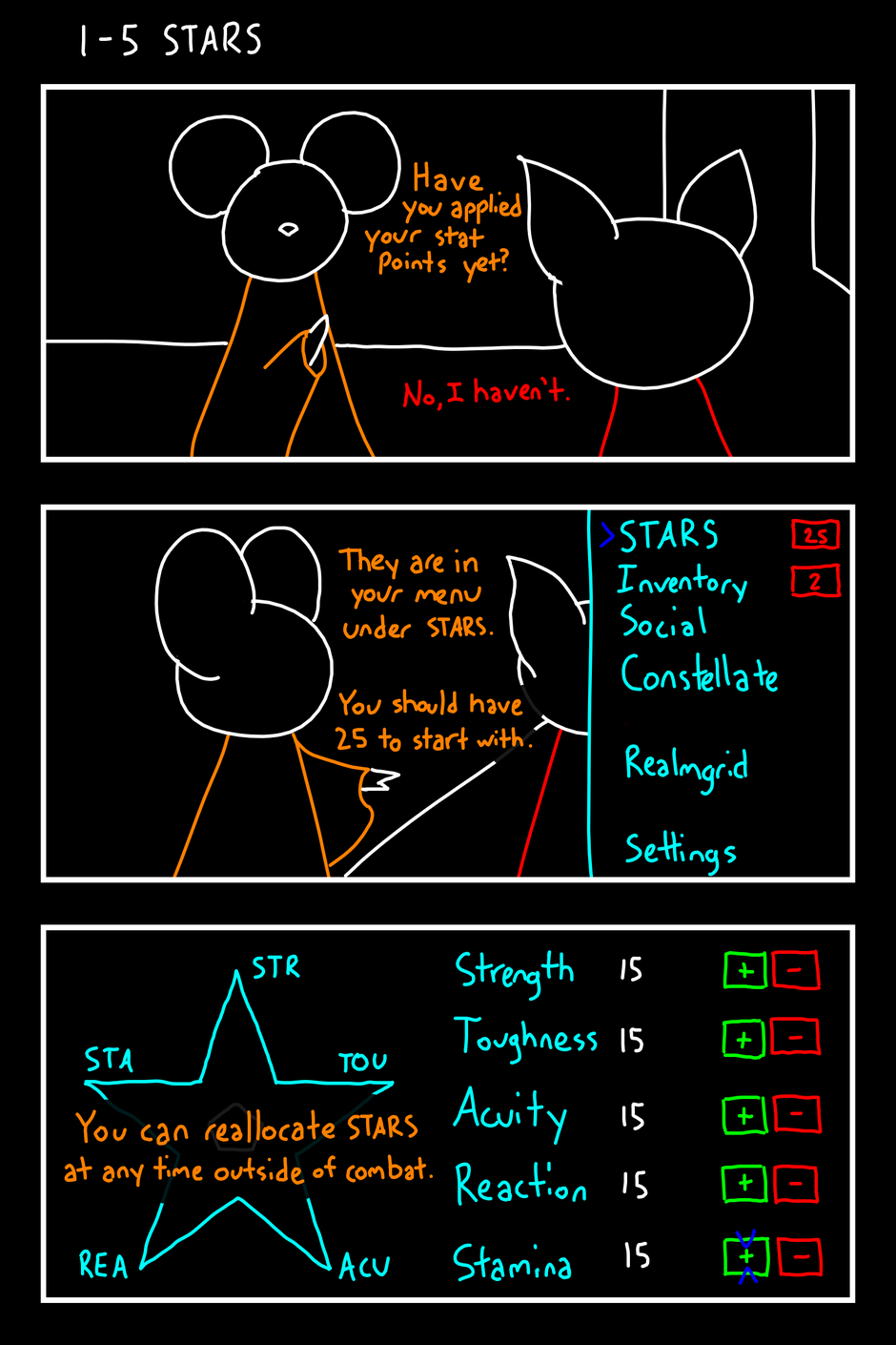 Have you applied your stat points yet? No, I haven't. They are in your menus under STARS. You should have 25 to start with. STARS 25 Inventory 2 Social Constellate Realmgrid Settings You can reallocate STARS at any time outside of combat. STR Strength 15 + - TOU Toughness 15 + - ACU Acuity 15 + - REA Reaction 15 + - STA Stamina 15 + -