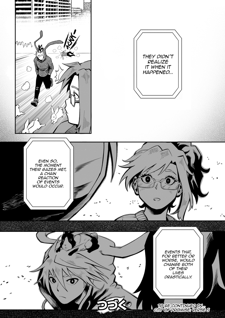 By pure chance, Siza and Michelle's paths begin to intertwine. Fun fact, chapters 1-4 were originally one big first chapter in our original draft. We ended up splitting it up in the final version, though. This chapter also marks the point in which the arts tyle will become more consistent. As the artist for this chapter, Tarotski, will handle the majority of the chapters from here on out.