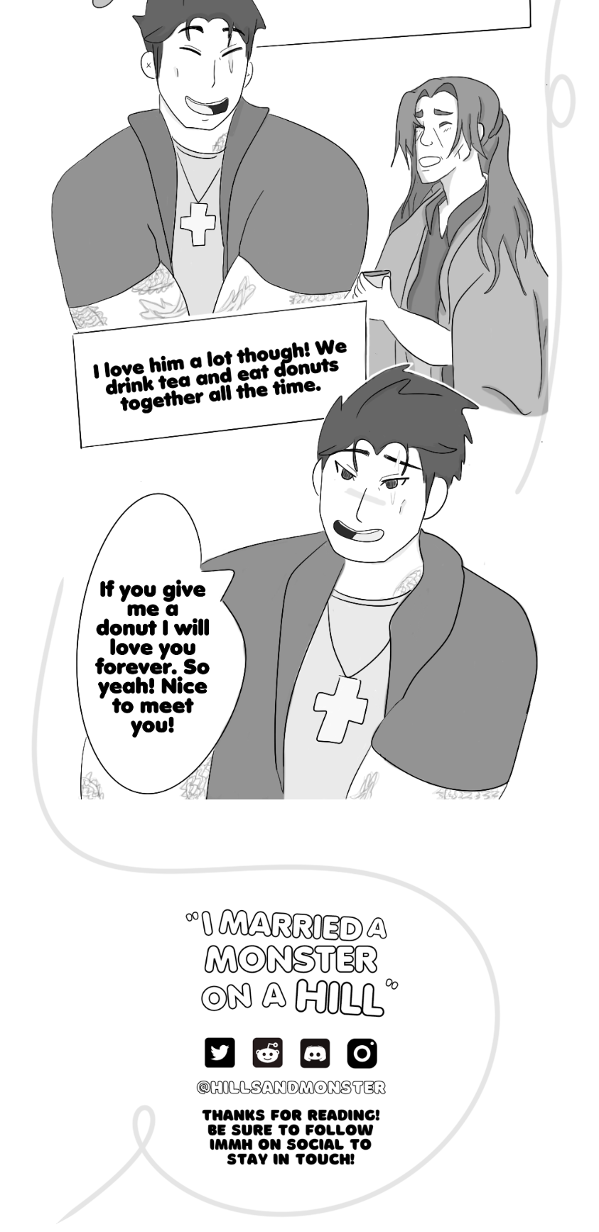 Get ready to dive into the heartwarming Boys Love world of "I Married a Monster on a Hill". Follow Bevvy a retired knight and husband, and August Hills his half-monster partner. This comic also features Girls Love and other couple dynamics, making it perfect for all romance fans. Don't miss out on the warm and fuzzy feels, with new episodes every Tuesday and Thursday morning and night!
