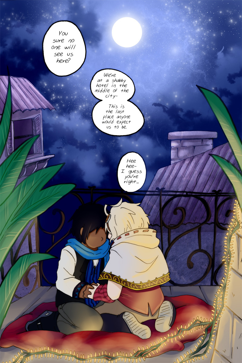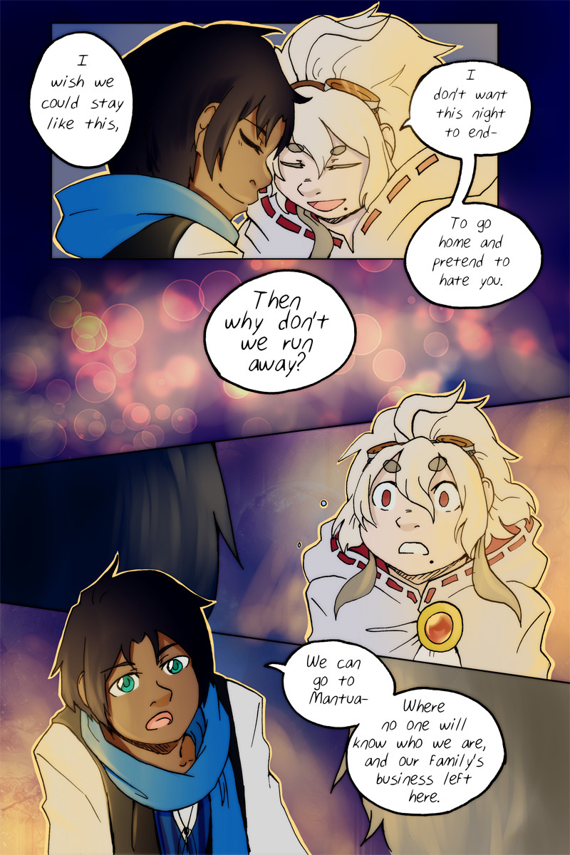 This was the first scene that I planned out visually- specifically the first page there (not the cover). Because of that it also is one of the pages that took the longest, and that's including scenery pages! It had to be p e r f e c t.