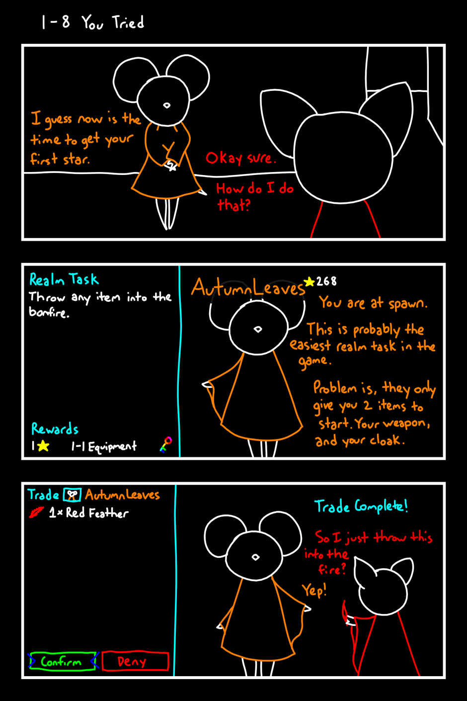I guess now is the time to get your first star. Okay sure. How do I do that? Realm Task Throw any item into the bonfire. Rewards 1 1-1 Equipment AutumnLeaves 268 You are at spawn. This is probably the easiest realm task in the game. Problem is, they only give you 2 items to start. Your weapon, and your cloak. Trade AutumnLeaves 1 x Red Feather Confirm Deny Trade Complete! So I just throw this into the fire? Yep!