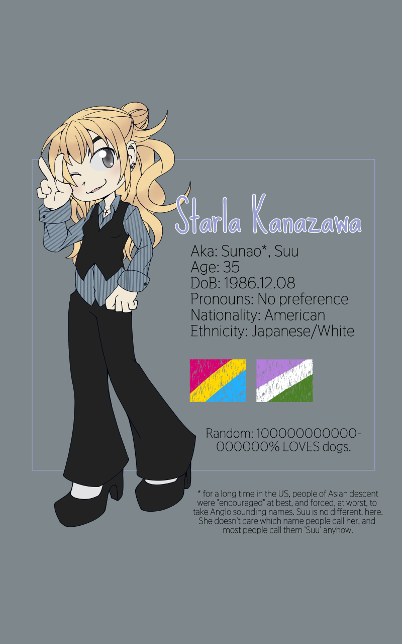 I am currently catching up on freelance comics at the moment, so no public comic this week, my apologies! Patreon will update as normal during April, however. In the meantime, let's learn a little about the folks we've met so far.
