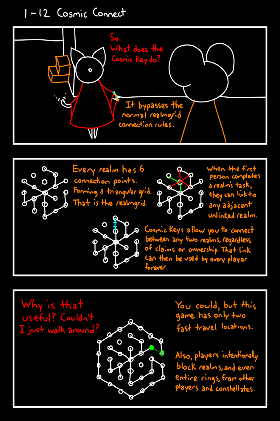 So. What does the Cosmic Key do? It bypasses the normal realmgrid connection rules. Every realm has 6 connection point. Forming a triangular grid. That is the realmgrid. When the first person completes a realm's task, they can link to any adjacent unlinked realm. Cosmic Keys allow you to connect between any two realms, regardless of claims or ownership. That link can then be used by every player forever. Why is that useful? Couldn't I just walk around? You could, but this game has only two fast travel locations. Also, players intentionally block realms, and even entire rings, from other players and constellates.