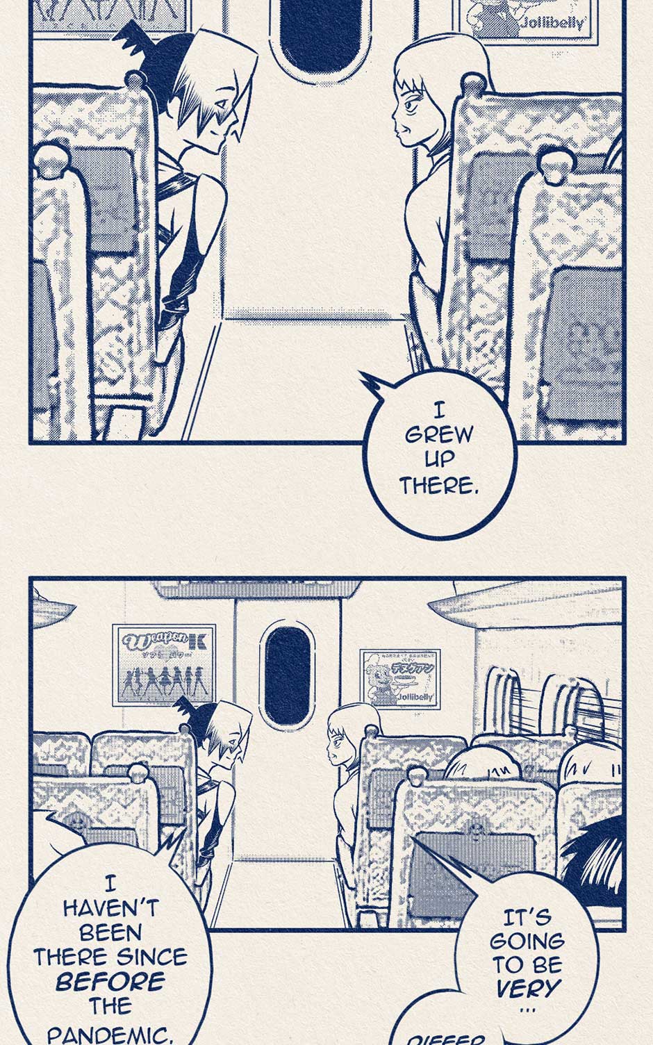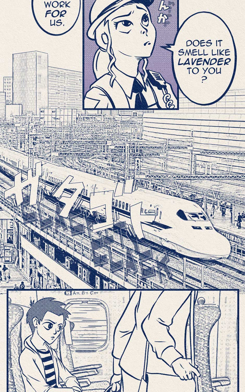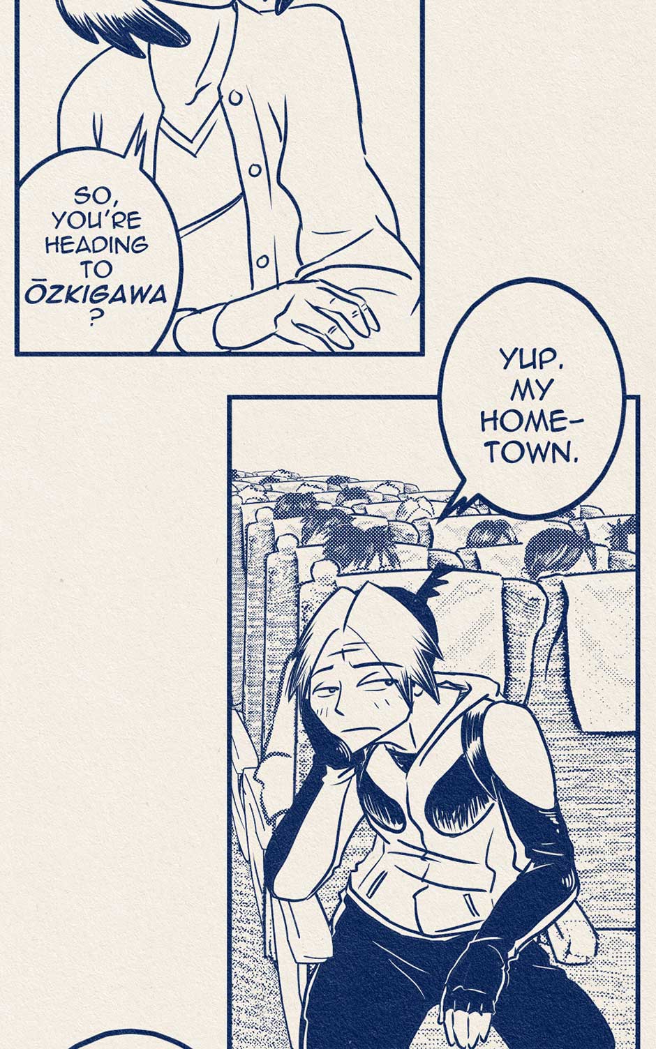 Koji talks to an old lady on the train.
