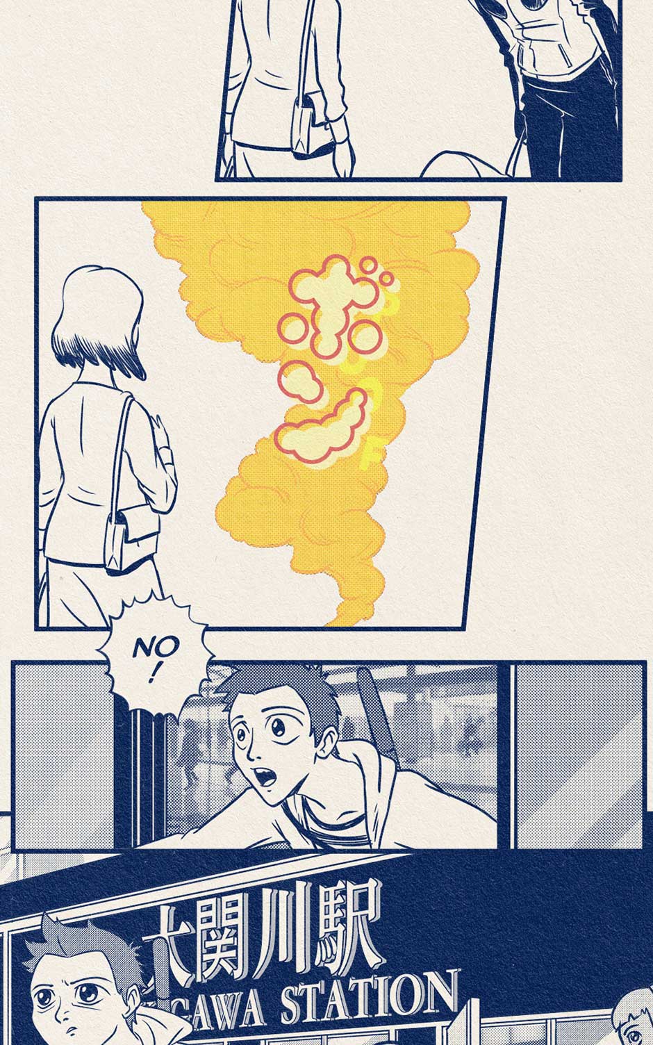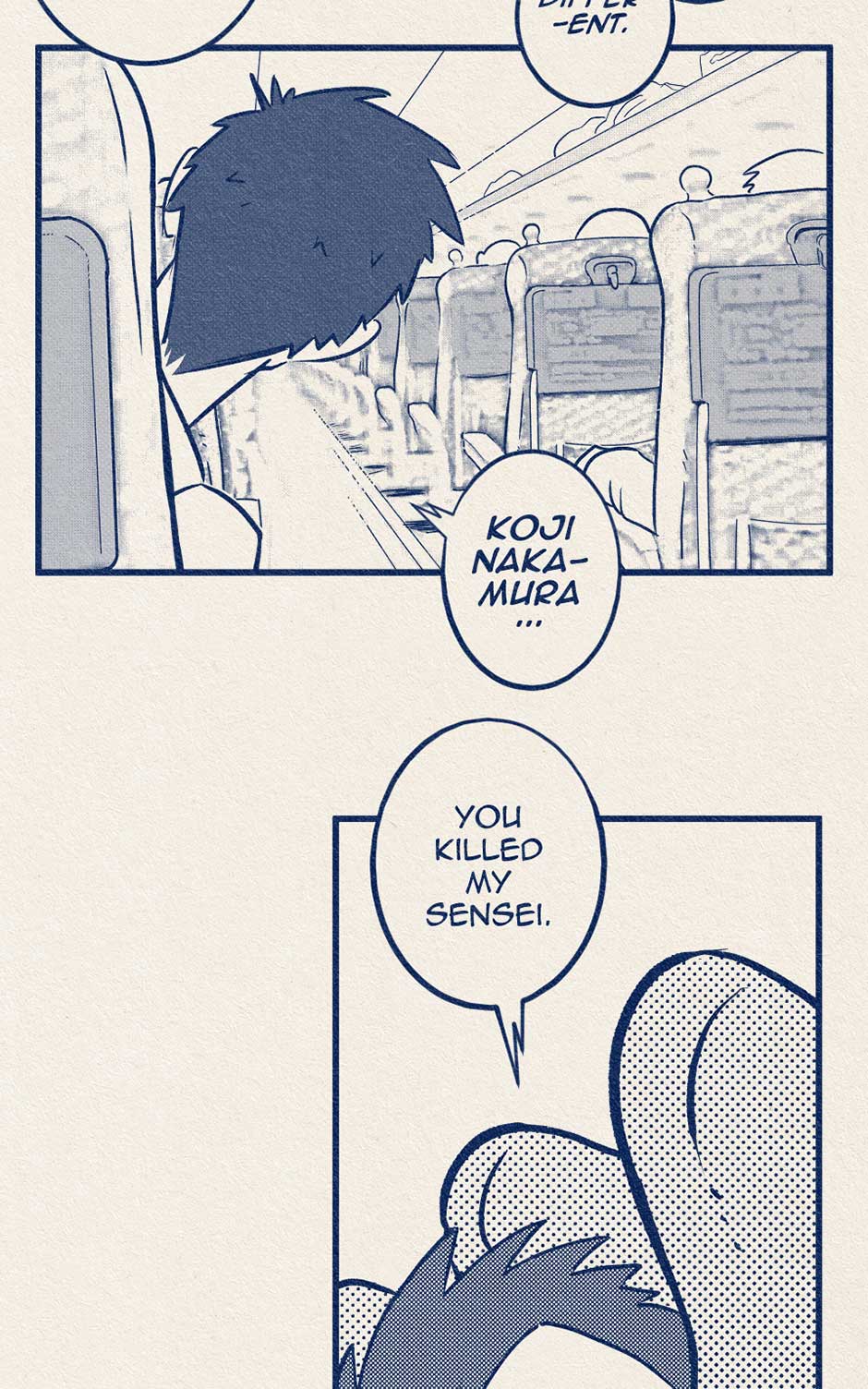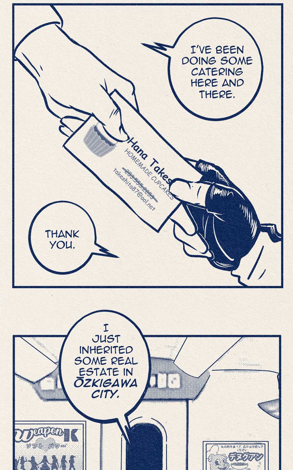Koji talks to an old lady on the train.