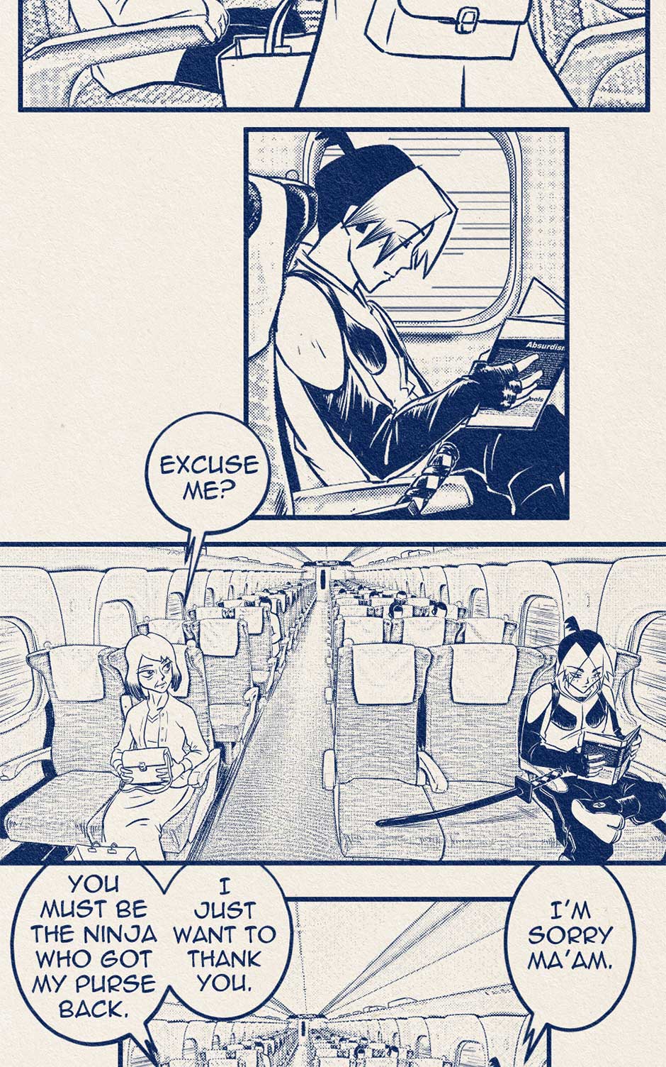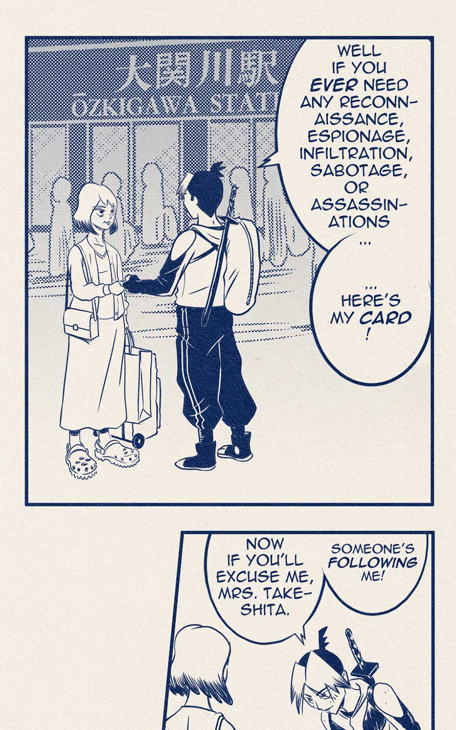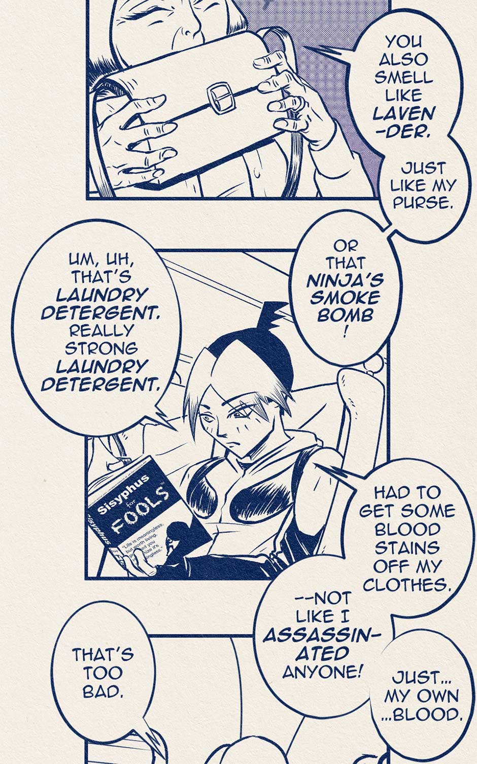 There are Ten Best Ninjas in the World. Each one strives to be The Very Best but must kill their way to the top in a deadly championship of death! Koji Nakamura just might be the Best Ninja in the World... but he really doesn't want to be. It's something his mom made him do. He'd rather take online Improv Comedy classes. But he is torn by his ambivalence and the perks of being one of the Best Ninjas in the World. Perks like 80% off oil changes, free monthly movie tickets, plus he might win that raffle at the International Ninja Union Annual Holiday Party! Follow Koji Nakamura as he travels around the World, tries not to die, and fails to tell his mother what he really thinks in this comic that sort of resembles an old manga.
