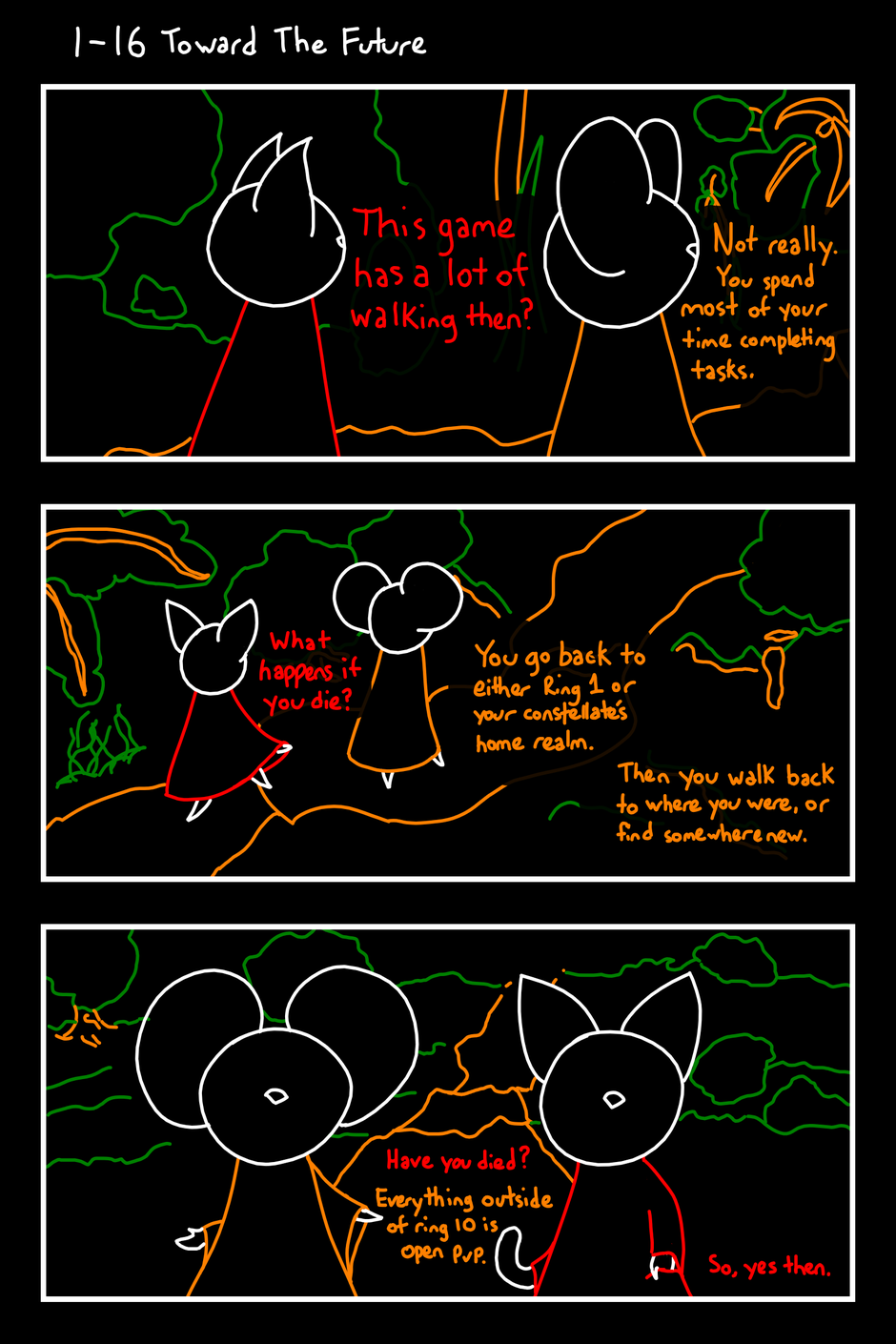 This game has a lot of walking then? Not really. You spend most of your time completing tasks. What happens if you die? You go back to either Ring 1 or your constellate's home realm. Then you walk back to where you were, or find somewhere new. Have you died? Everything outside of ring 10 is open pvp. So, yes then.