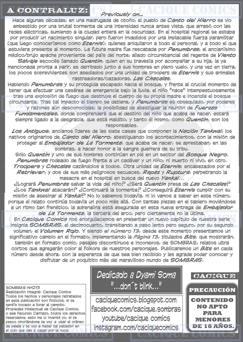 Bienvenidos, estimados lectores y/o seguidores a SOMBRAS 013: Embajador de La Tormenta pte. III. En Cacique Comics nos enorgullecemos enormemente de estar publicando esta nueva entrega de SOMBRAS, que llega para contarnos un poco más de lo acontecido décadas atrás en esa fría noche de otoño en Canto del Hierro, y se pone peliaguda la cosa en este número.