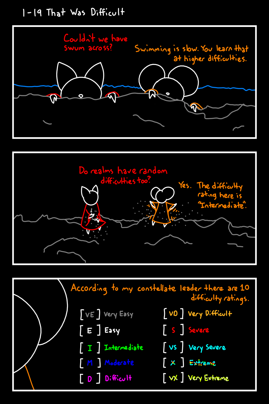 Couldn't we have swum across? Swimming is slow. You learn that at higher difficulties. Do realms have random difficulties too? Yes. The difficulty rating here is "Intermediate". According to my constellate leader there are 10 difficulty ratings. [VE] Very Easy [E] Easy [I] Intermediate [M] Moderate [D] Difficult [VD] Very Difficult [S] Severe [VS] Very Severe [X] Extreme [VX] Very Extreme