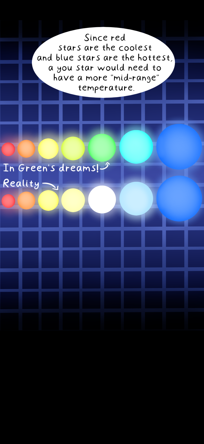 Fun fact 2! Our own sun actually peaks in green! But as this episode has shown you… will appear white due to the other colours also emitted by the sun. (The sun emits all wavelengths of light from radio waves to gamma rays.)
