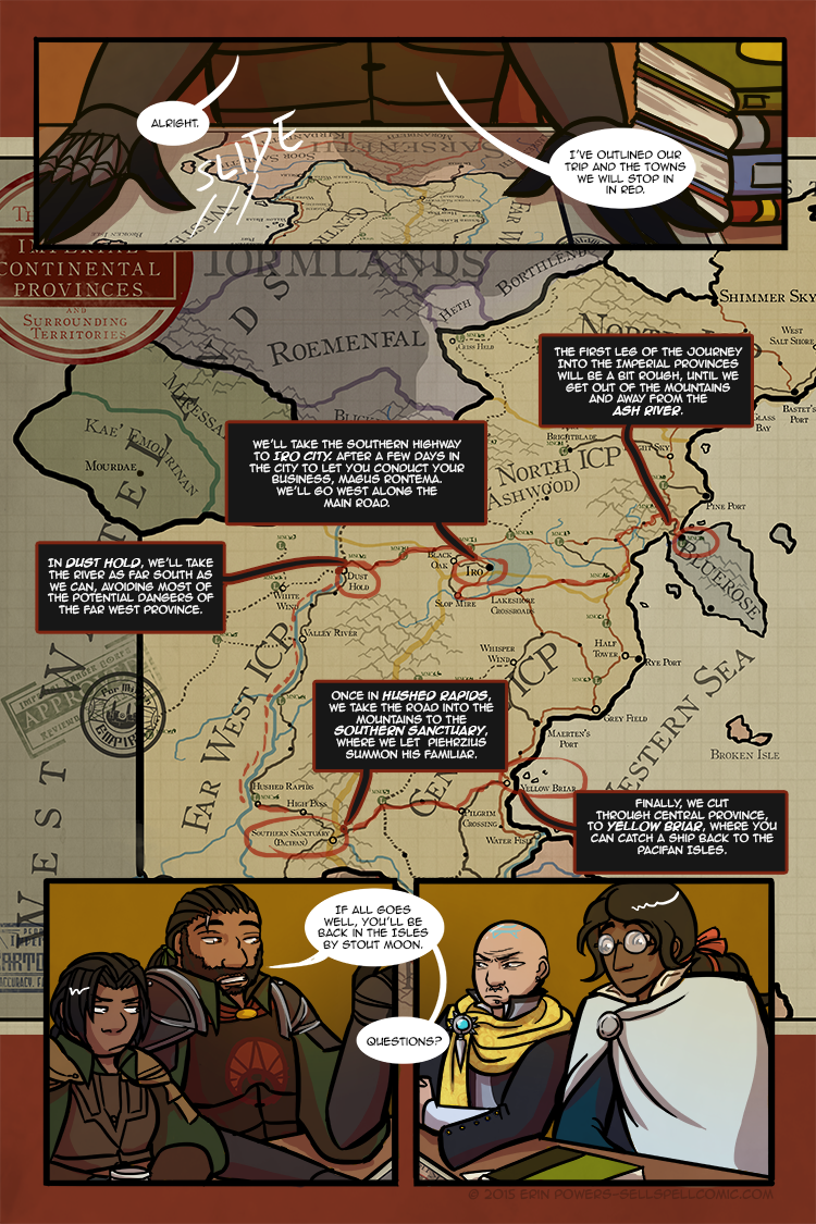 No update next week, unfortunately. I’ve been sick on and off for the past month and my page buffer took a hit. BUT, stop by the site next Tuesday for a full view of the map, and Sell Spell will return with normal pages on February 23rd!
