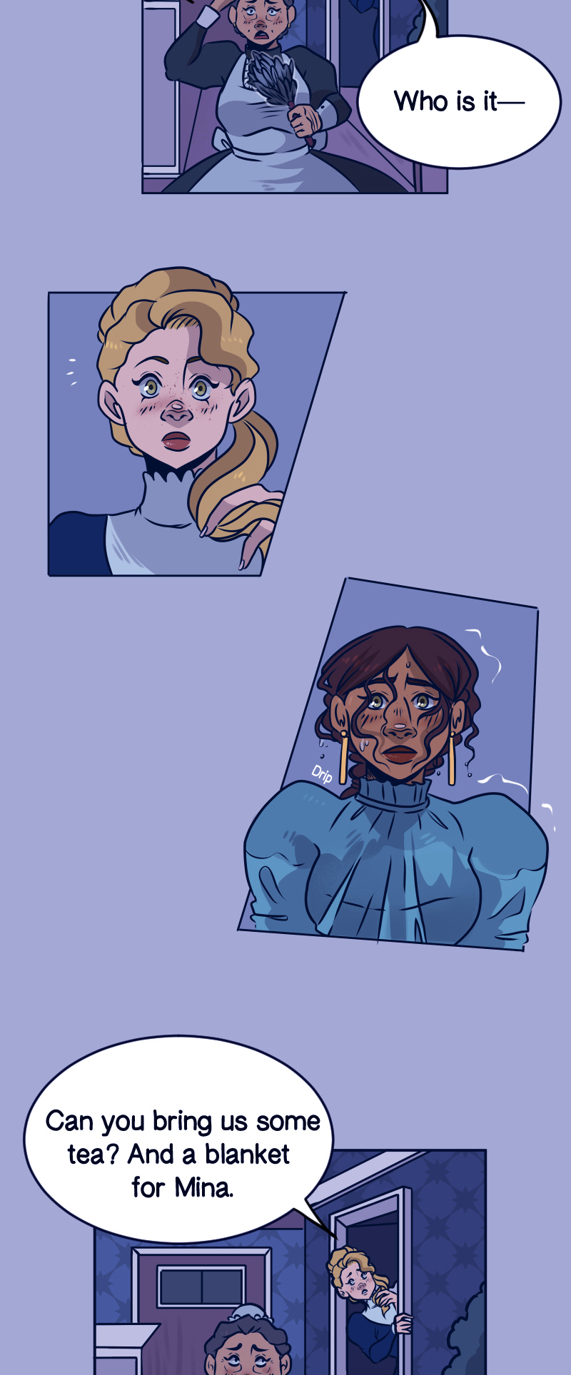 There was quite a few layers to Victorian clothing: the chemise (smock), drawers (underpants), corset, petticoat(s), shirt, skirt and perhaps a jacket. Not to mention the voluminous fabric at the shoulder for those big, puffy, sleeves. One source I found online said an outfit could weigh 8-12 pounds! Suffice to say it would be heavy when wet, no wonder Mina is hugging and puffing.