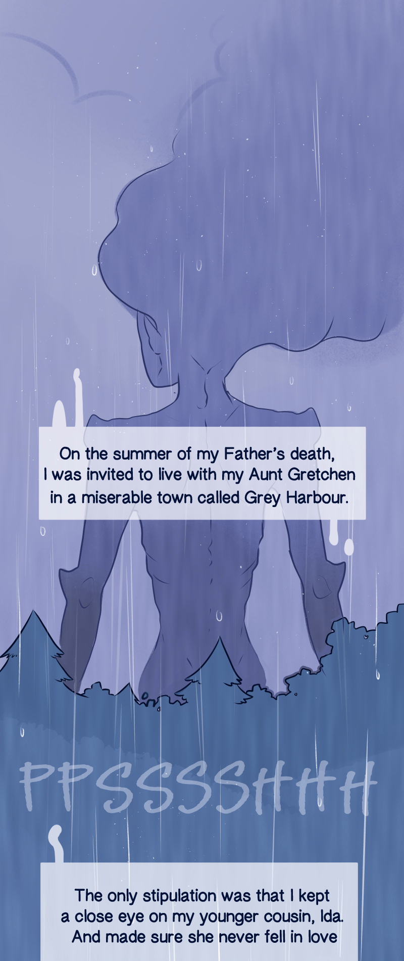After the death of her Father, Whilhelmina "Mina" Fisher is invited to live with her Aunt in a mysterious town where it rains all the time. Her Aunt asks Mina to keep a close eye on her younger cousin, Ida, and make sure she doesn't fall in love. That's easier said than done, especially when Mina is distracted by something paranormal lurking in the rain…