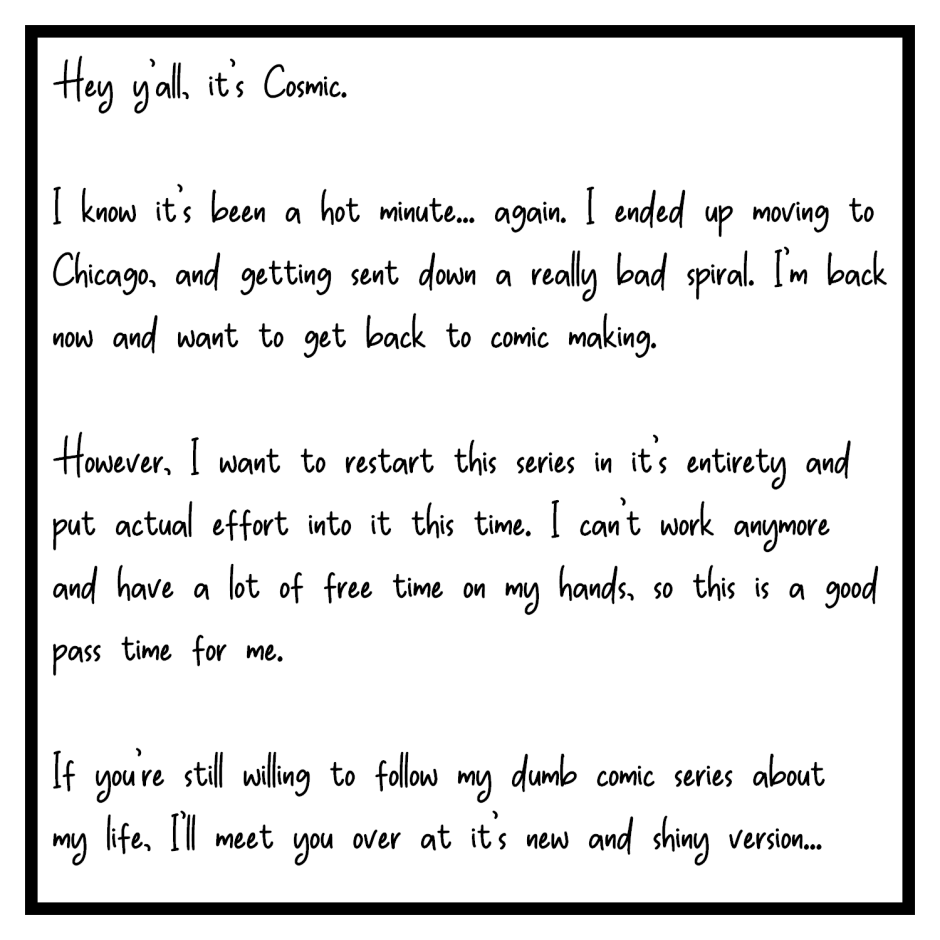 Thank you to everyone still around to follow my restarting of this comic. I appreciate all of you. I hope to see you all at the new version of my comic. I'll be getting it posted ASAP.