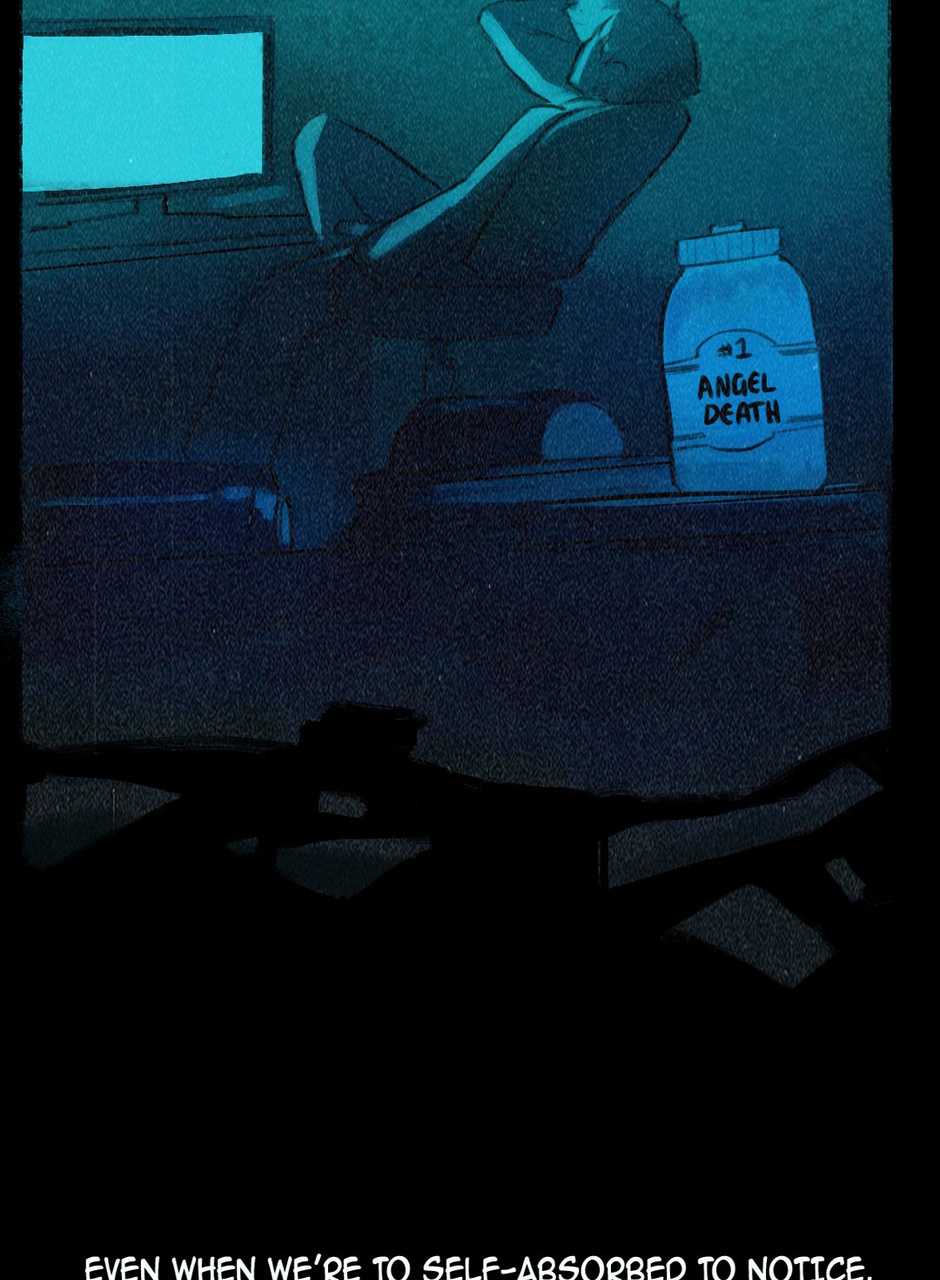 I can hear the sfx in my head as I'm reading this. Great pacing. And kudos to your artist for the fabulous artwork. Btw, there's a small typo on the last line. It should be: "Even when we're TOO self-absorbed to notice." Unless that was intentional given the message of that line? lol