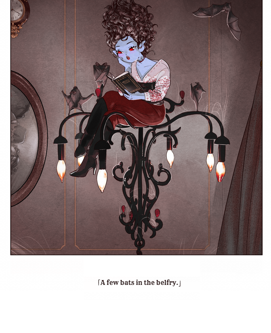 This is so frickin cute! I love that she is so calmly reading while upside down on the chandelier. Also the bats are adorable and your art is so beautiful.