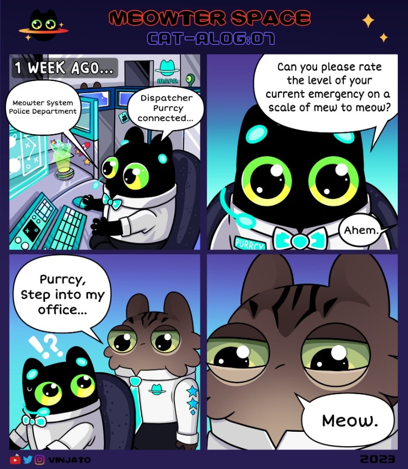 CAT-ALOG: 07 "Dispatcher Purrcy, connected. Can you please rate the level of your current emergency on a scale of mew to meow. Burn. My. Whiskers. Your owner tried to do WHAT!?-- Pet your tummy?!? I am sending ALL unites immediately!!!" - Purrcy