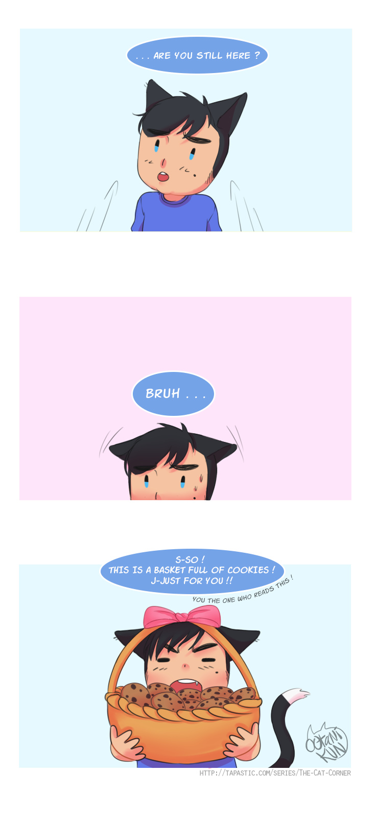 HELLO EVERYONE ! L-long time no see right ? I'm so sowwy about that ... But these time, I'm like in "Artblock" about my webcomics ... But I'm not innactive. I draw mostly on Picarto, DeviantArt, Tumblr and Twitter ! And stream often @_@( https://picarto.tv/TheCatCorner ) I open commissions too ... If you are interested in ! ( http://tinyurl.com/commissions-infos ) I hope that you like cookies ewe