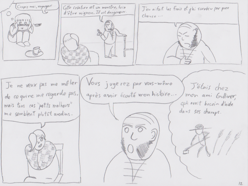 A 23-page comic made in 23 hours for the "23h de la BD". It is in French and very quickly drawn to fit the timeline. The theme of the challenge was "Winged creature" and there was a constraint "a sequence must make no head or tails".